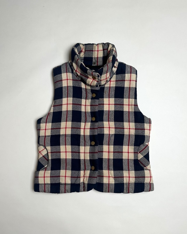 00’s〜 柔らかな織りのフランネルシェルに、ポップで目を惹く高配色チェックが映えるダウンベスト。 ハイネック仕様にポケット付きで実用性も◎ アウターとしてはもちろん、インナーダウンとしても活躍する万能な1着。 USノリでもアウトドアノリでもない、今の都会的なムードにハマる洒落たルックス。 近年モノの良さを改めて感じさせてくれるアイテムでした。 メンズ・レディース問わず◎ 【condition】B 【material】表記なし 【color】BEIGE.NAVY.RED 【size】 着丈:52cm 身幅:52.5cm 肩幅:36cm