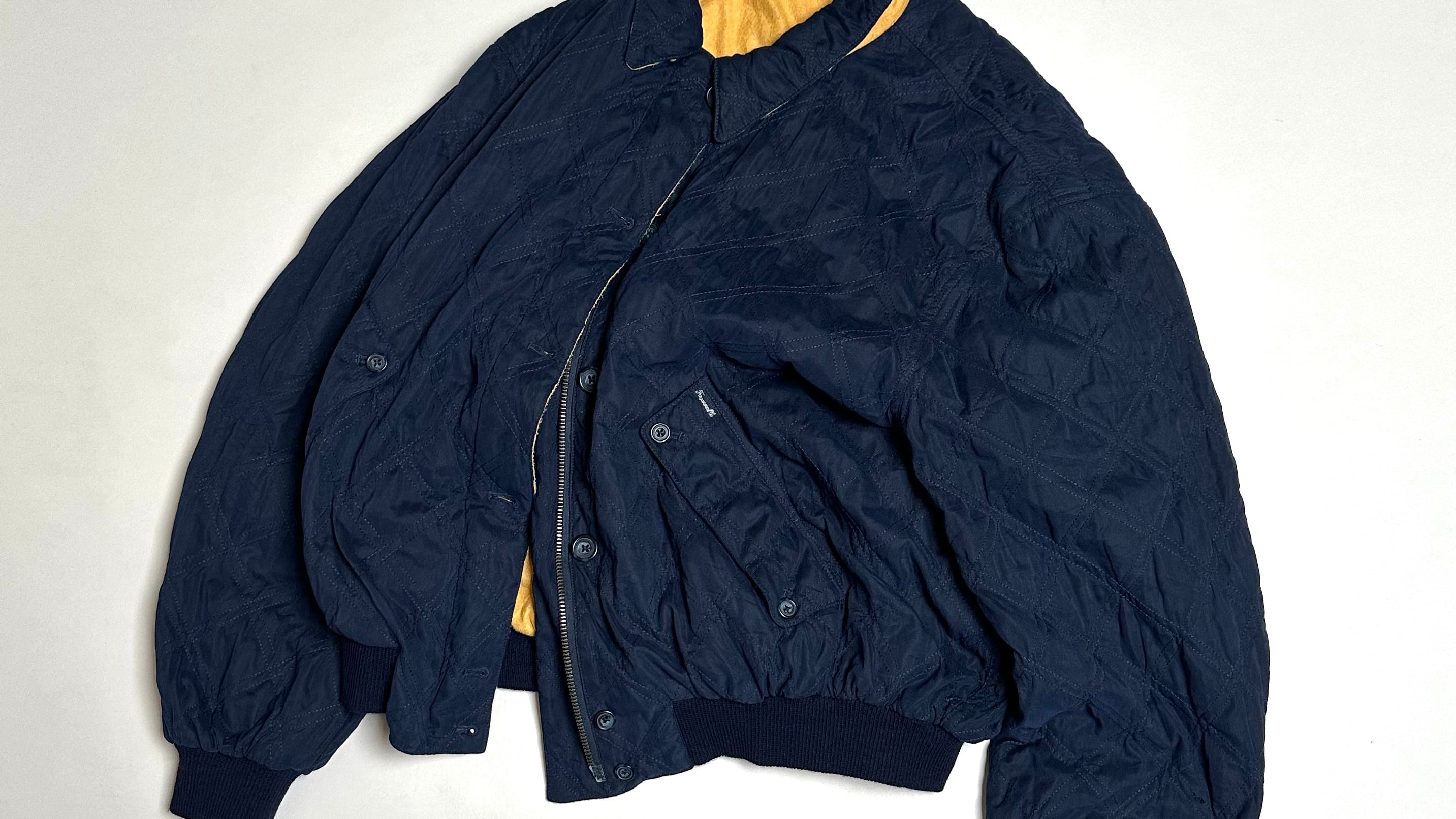 90's EURO MA-1ライクな見た目にシルク特有の光沢のある表情に若干のフェードの入った雰囲気のある一枚。 シルク特有のアンニュイなネイビーにブラウンのリブの高配色◎ ライトにシャツ感覚で羽織れる汎用性と古着らしい生地の風合いも楽しめる素晴らしい1着かと。 丸みを帯びた気分なシルエットとリブの状態も非常に良くシルエットの変化も◎ とてもオススメ。 【condition】B 【material】SILK:100% 【color】FADE NAVY 【size】 着丈:64cm 身幅:63cm 肩幅:57.5cm 袖丈:59cm MODEL:173cm