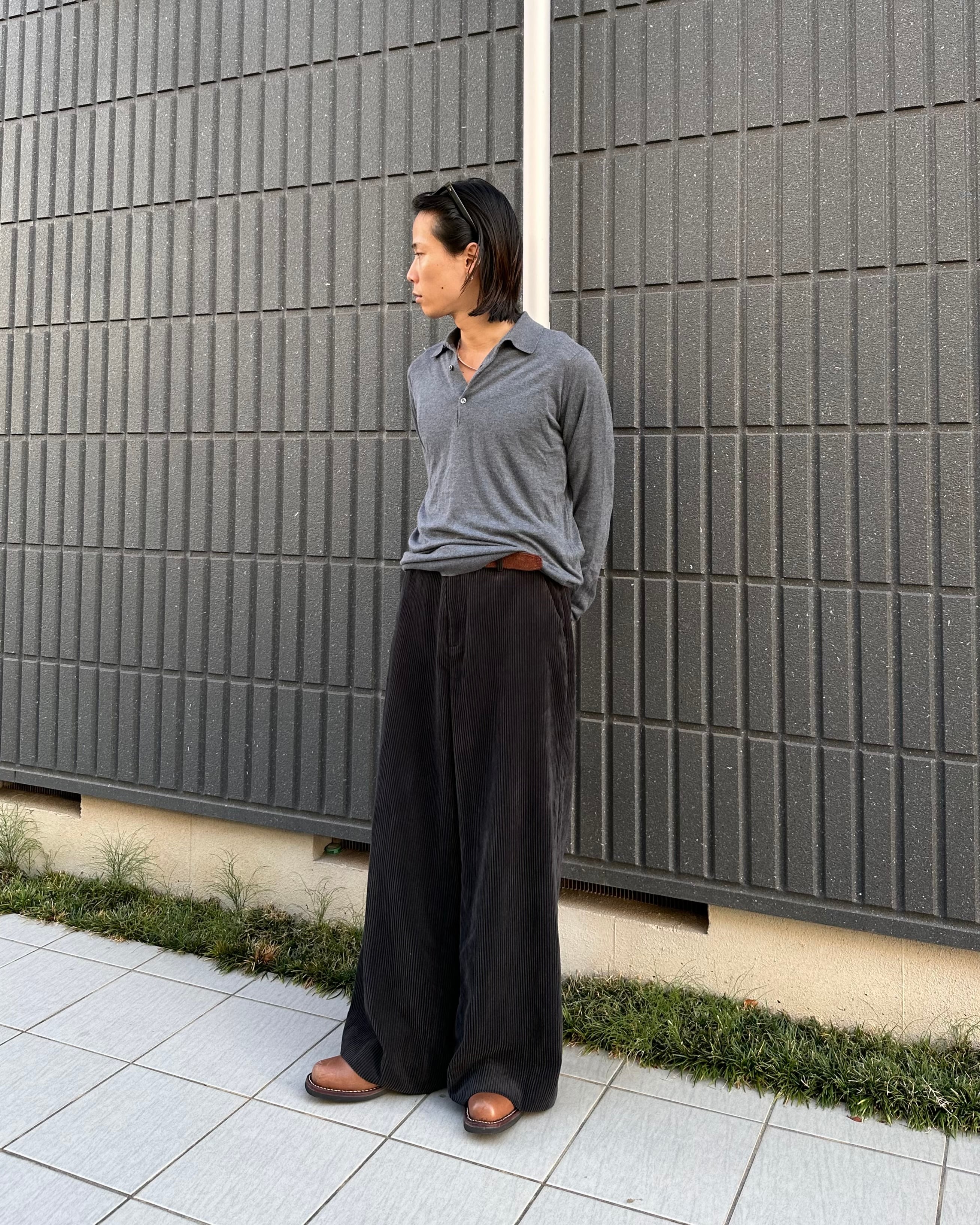 青みがかった深いグレートーンに無駄のないシンプルなルックスに生地への拘りを感じるこのブランドらしい一枚。