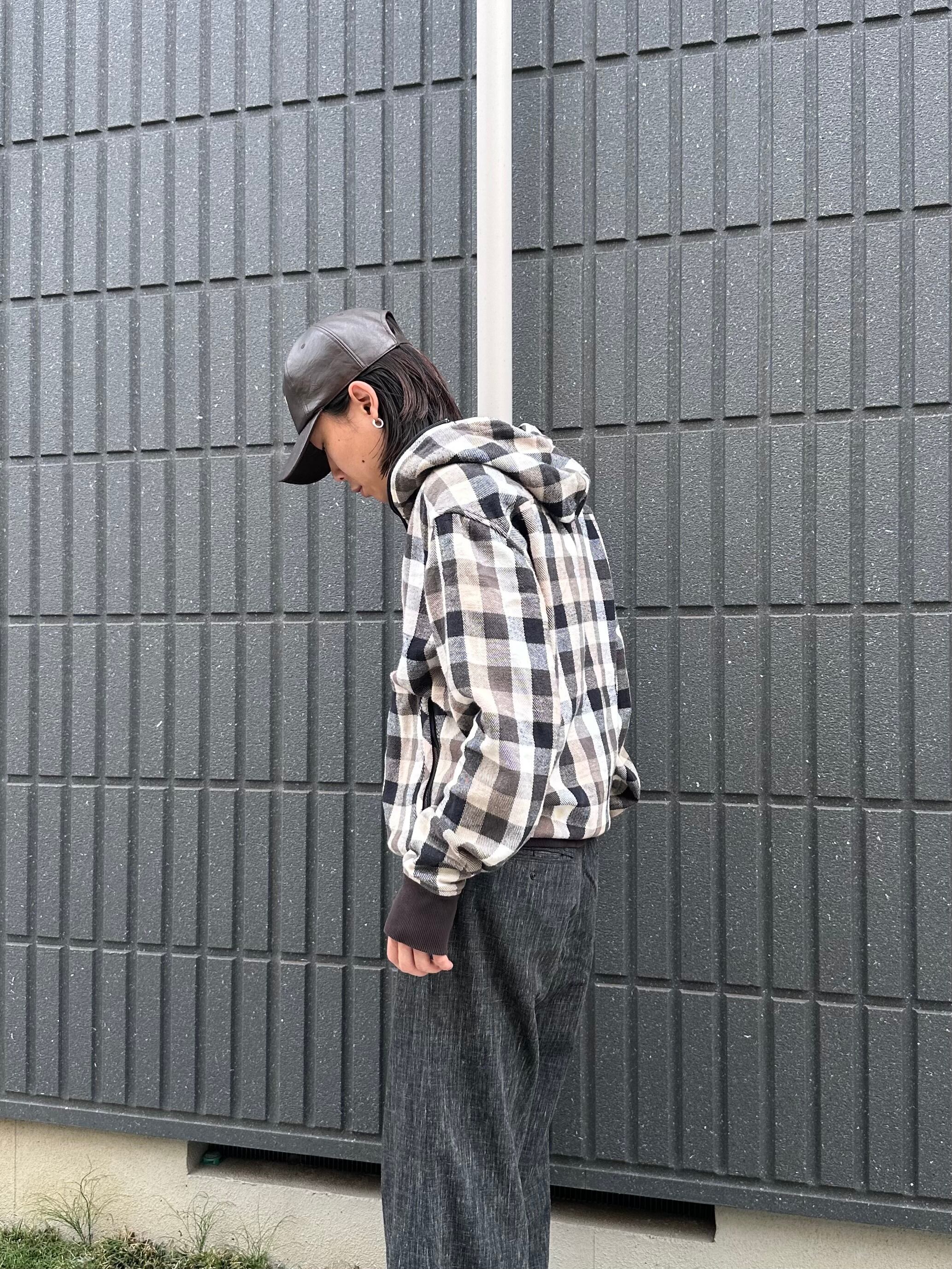 ホワイト×ブラックのモノトーンにブラウンを差したブロックチェック柄が印象的なジップアップフーディ。