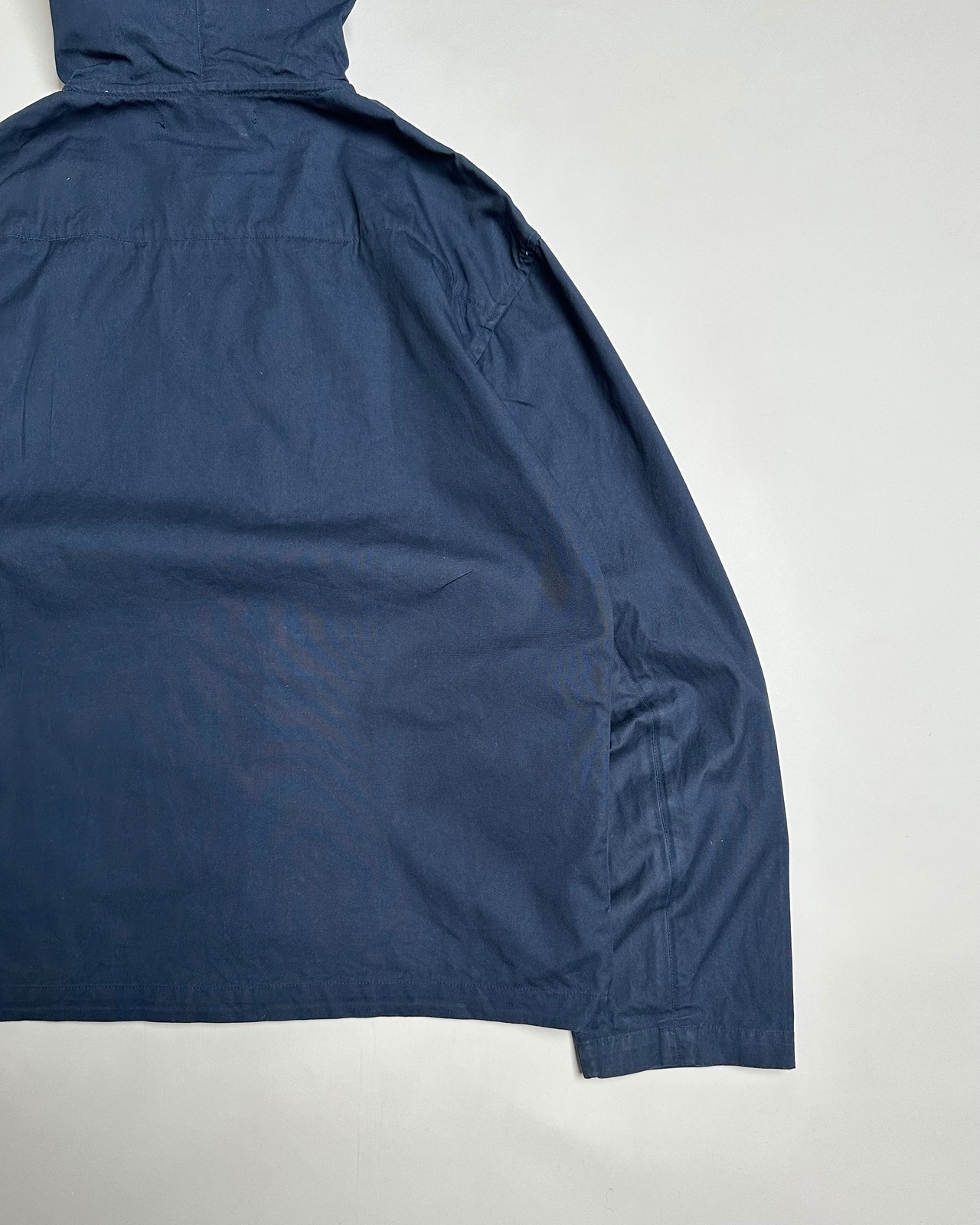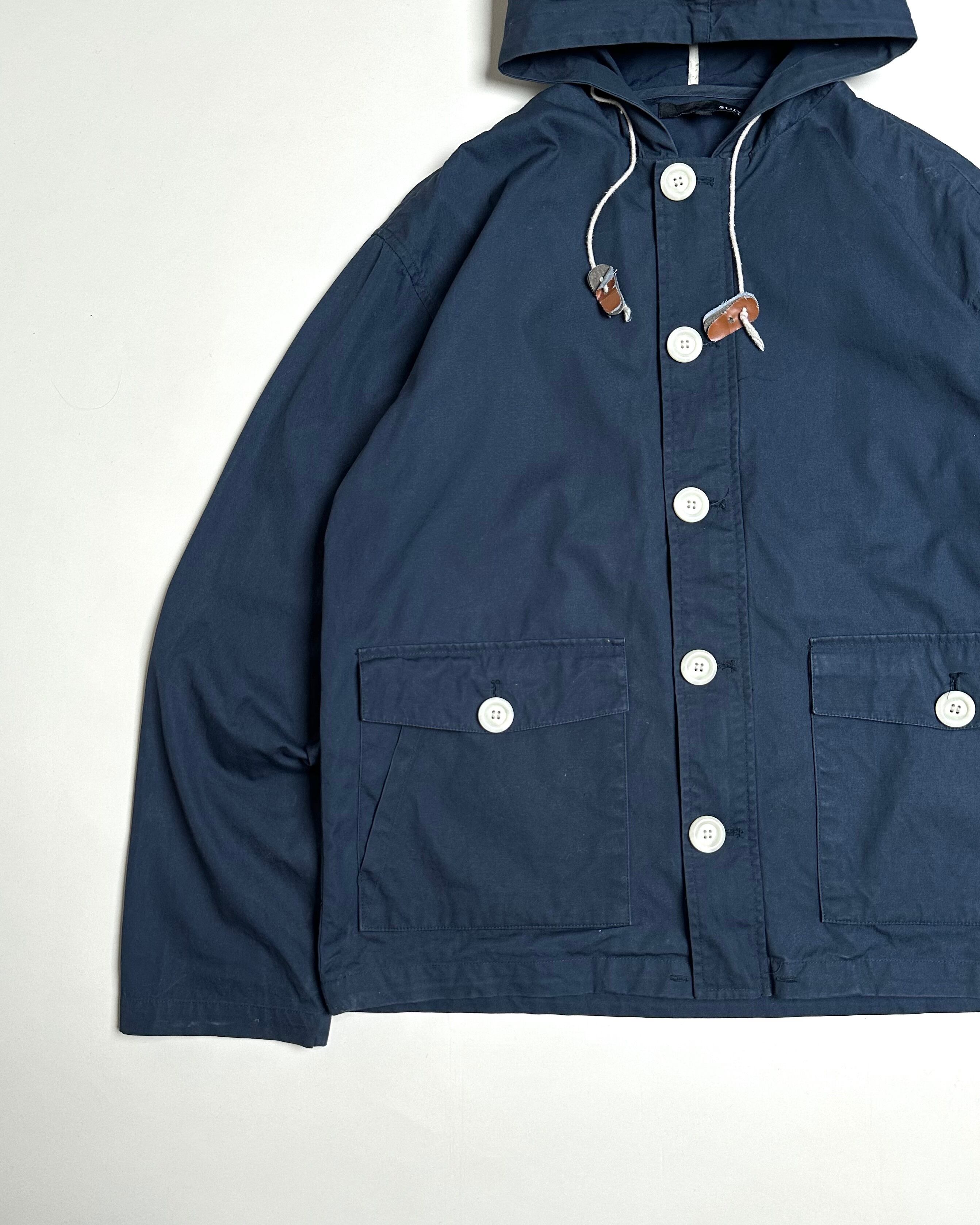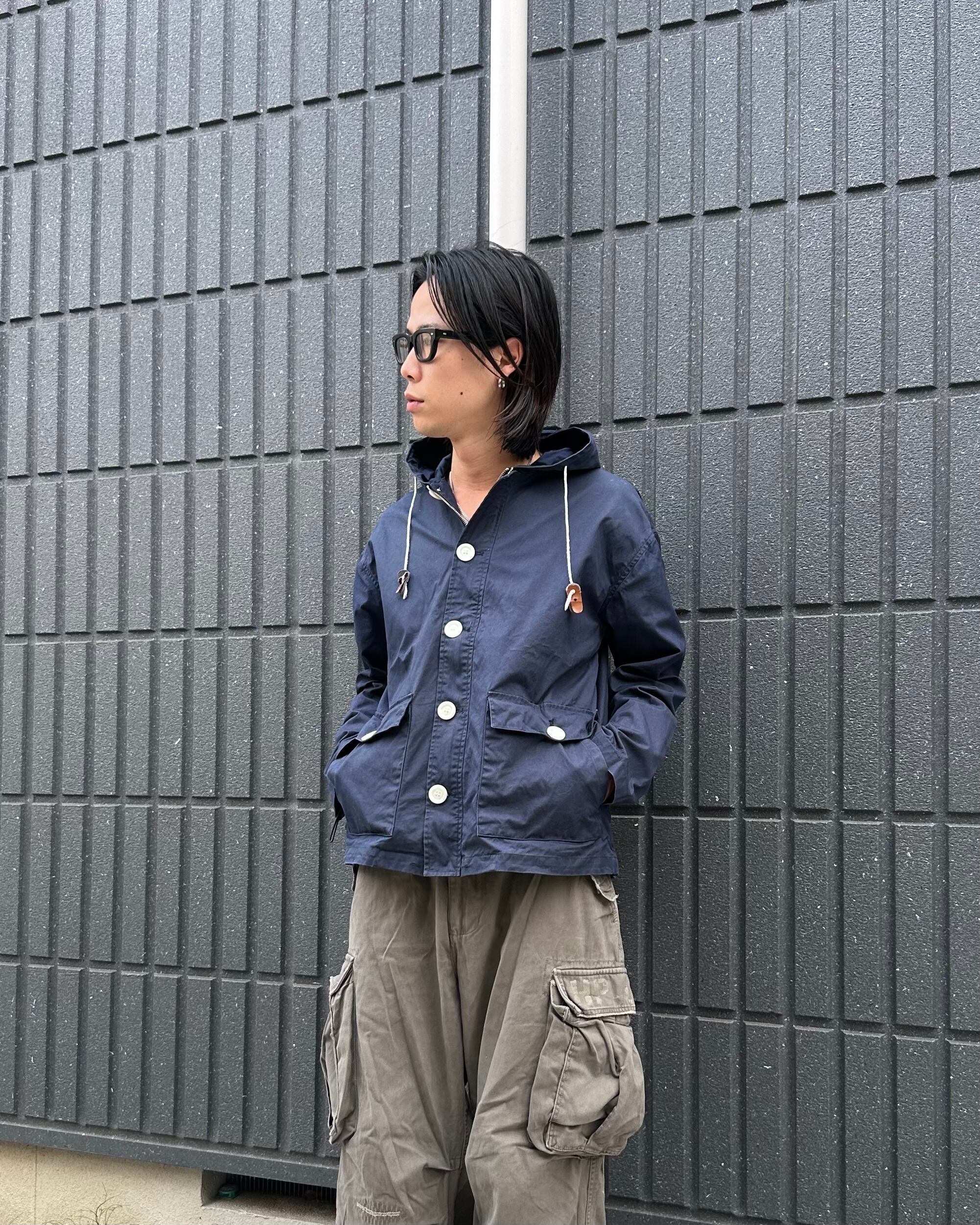 サルベージパーカーの様なルックスで前開き仕様。深めのネイビーボディに映えるホワイトのデカボタン。