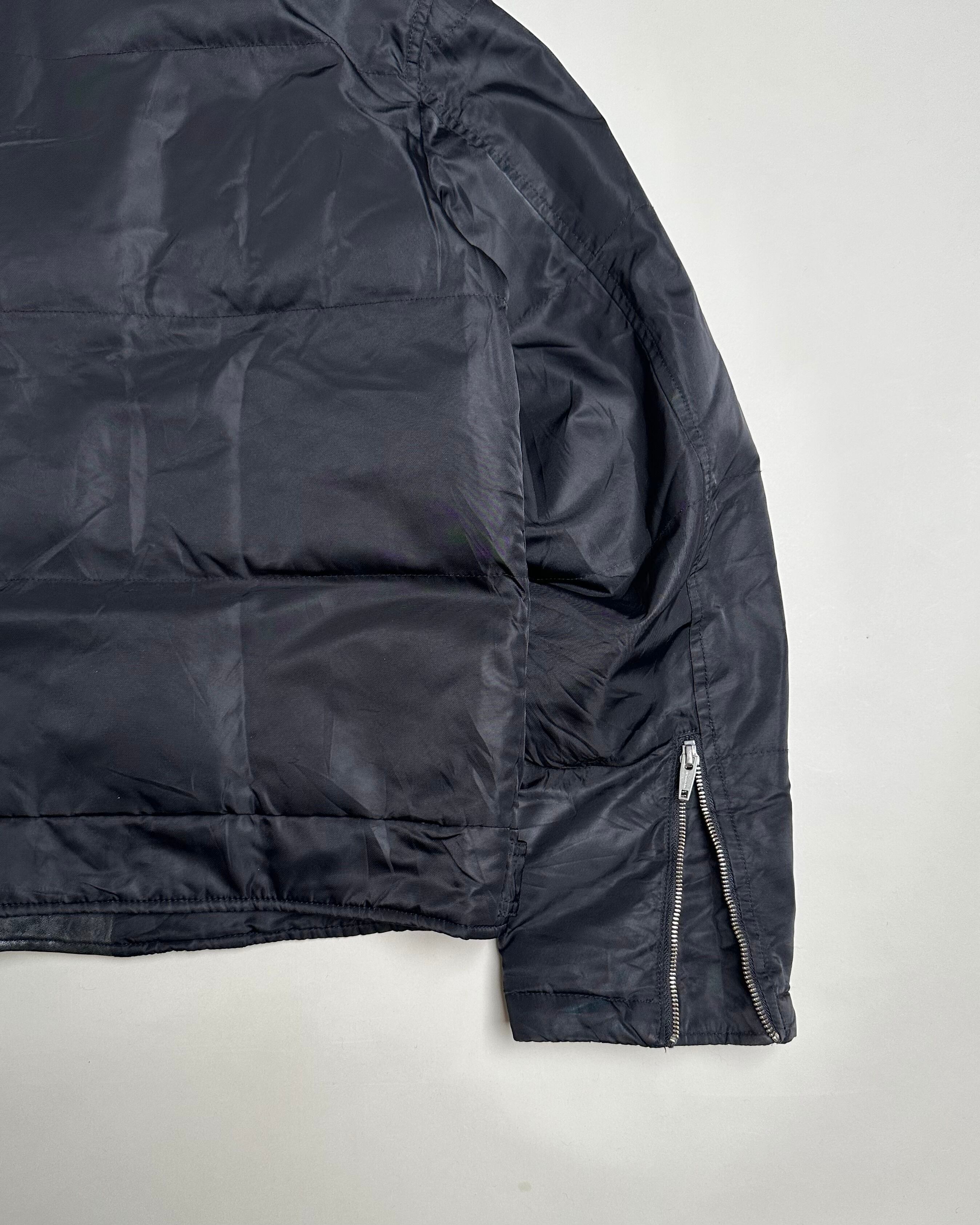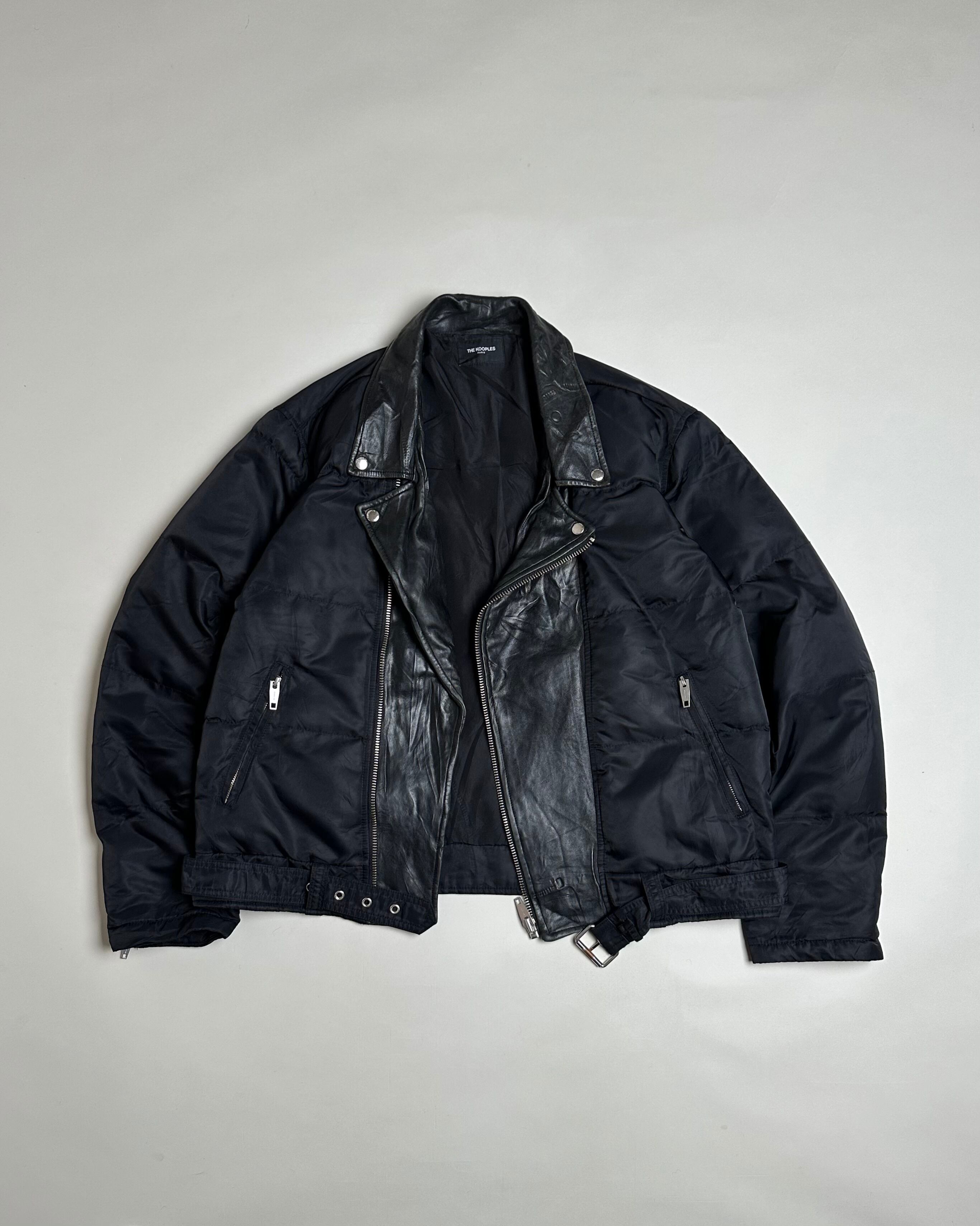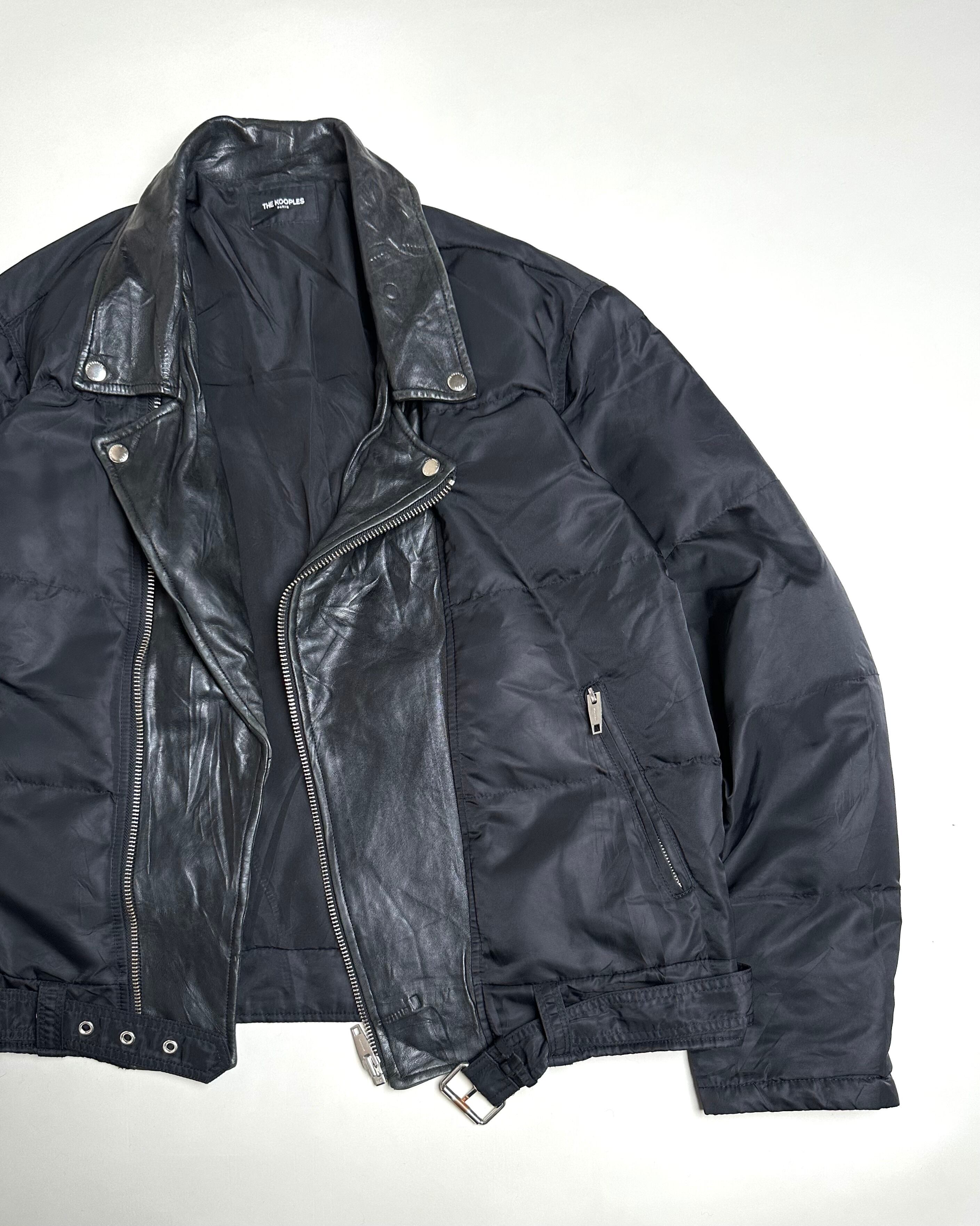 レザーとナイロンの秀逸な異素材切り替えデザインのライダースパファージャケット。