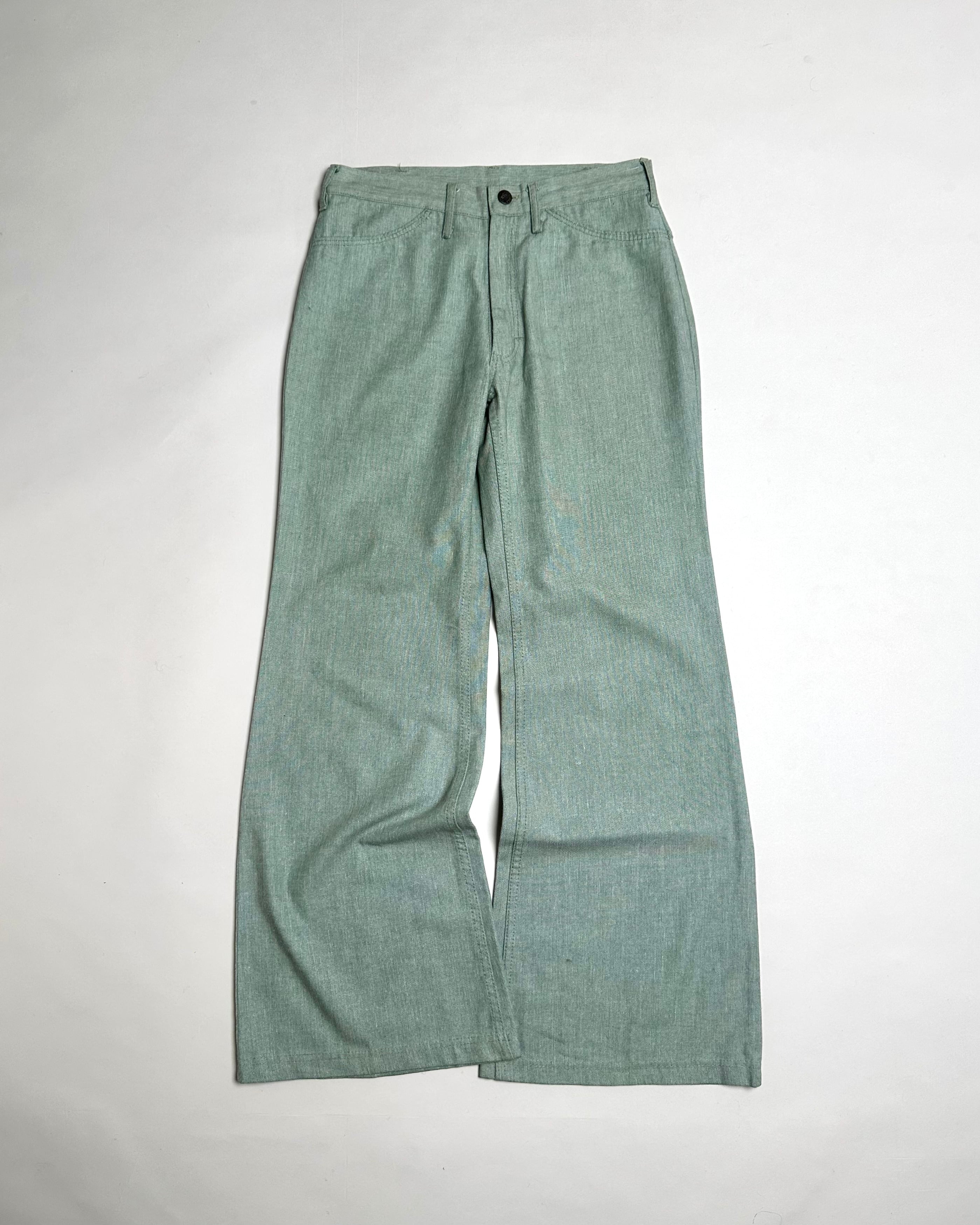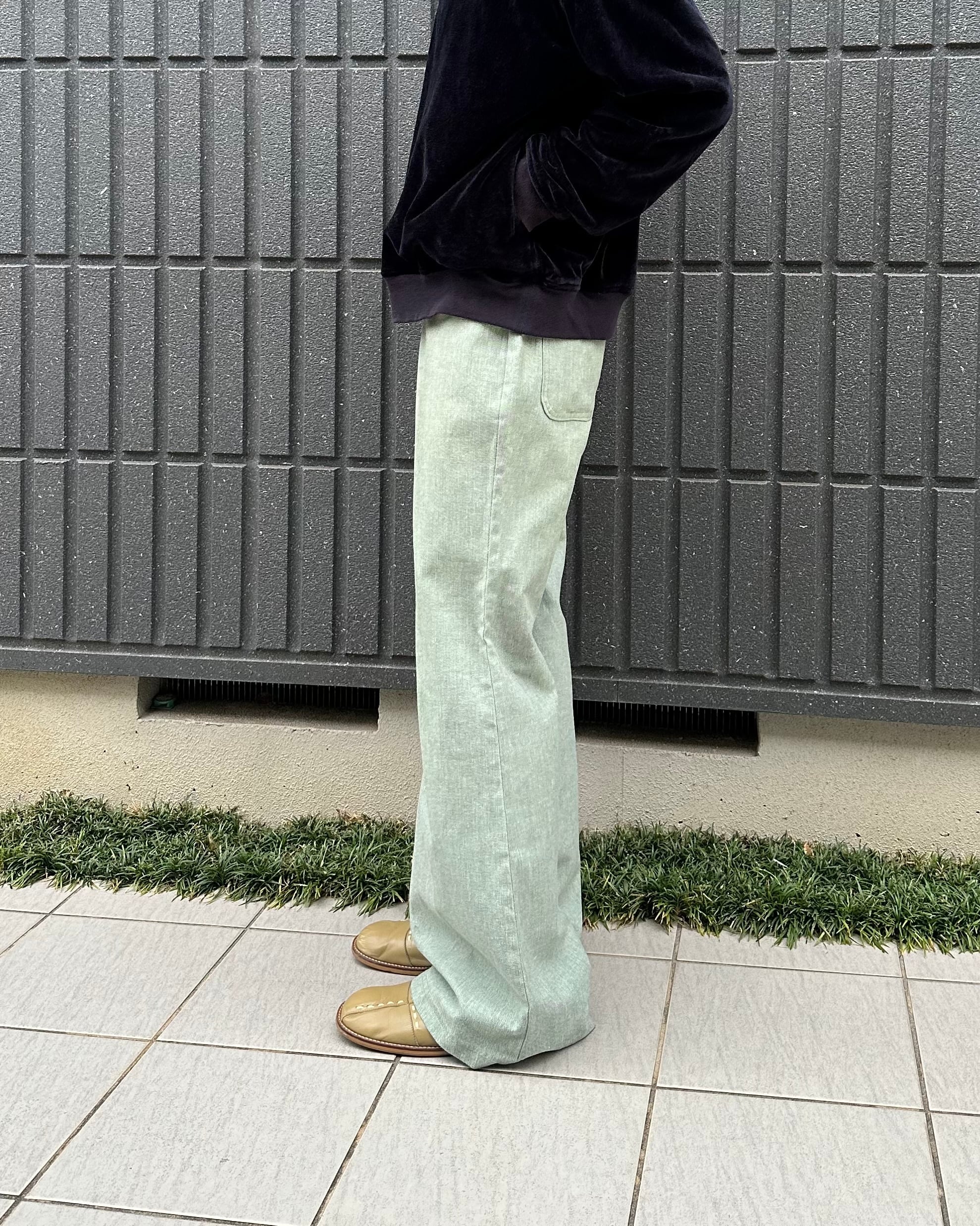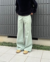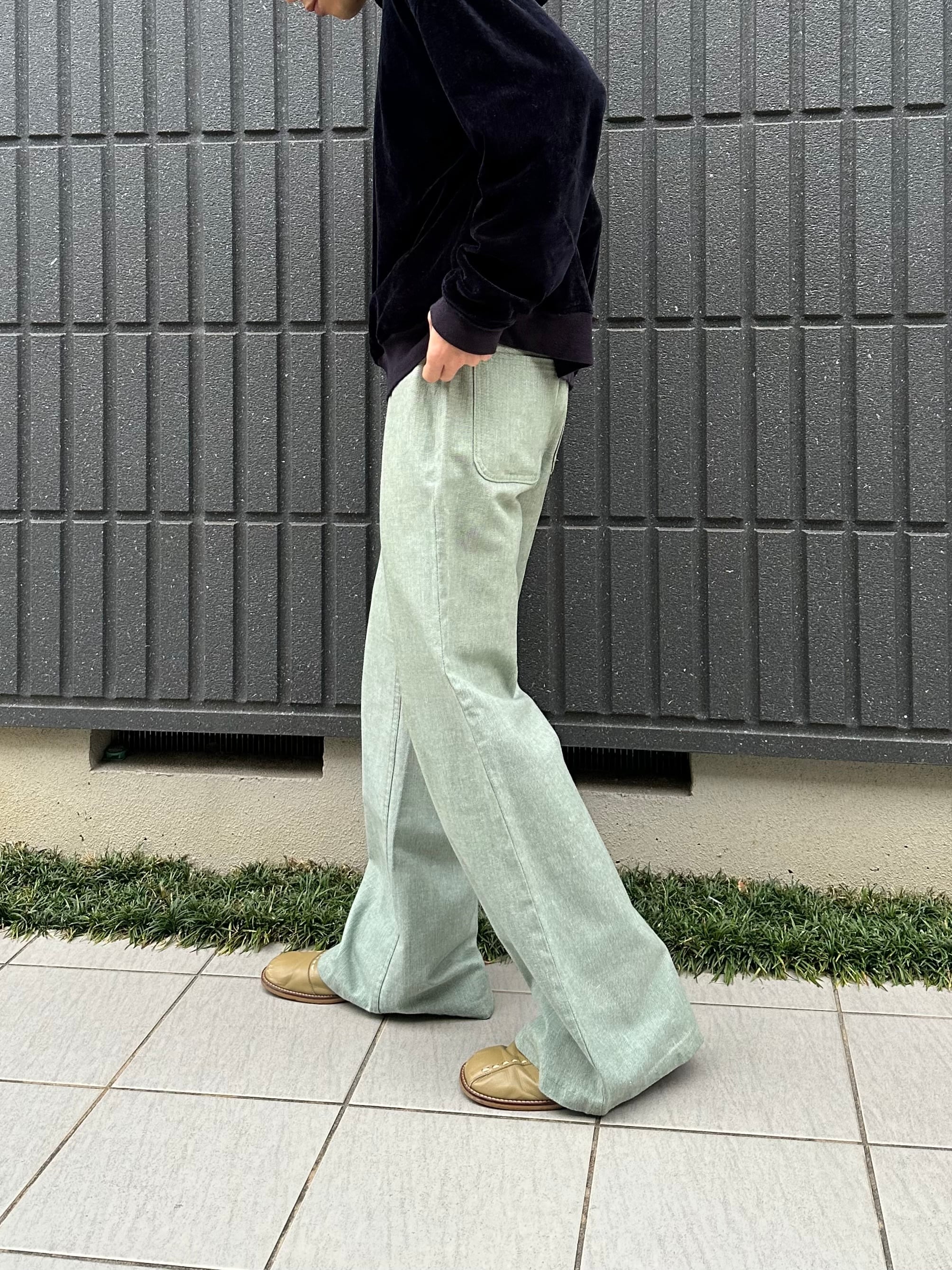 裾幅31.5cmの圧巻のワイドシルエットに、奥行きのある美しい縦落ち。ラグジュアリーブランドを思わせるライトグリーンのトーンも非常に印象的です。