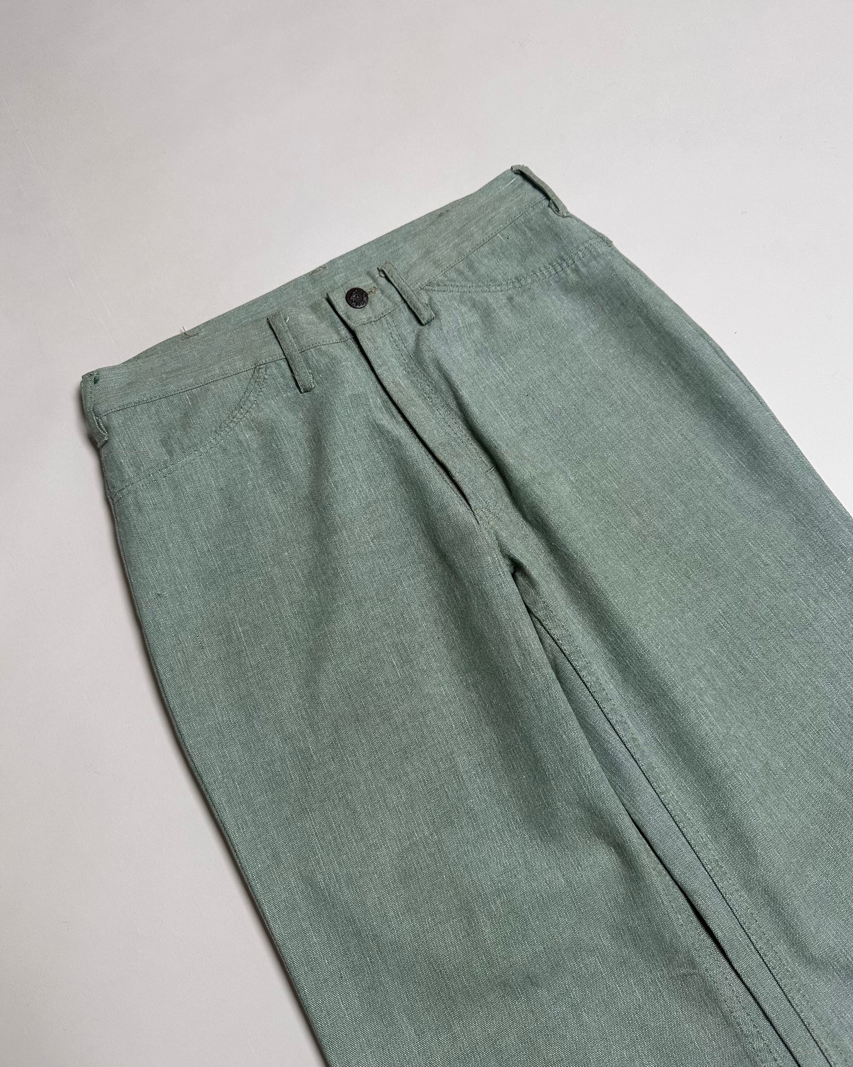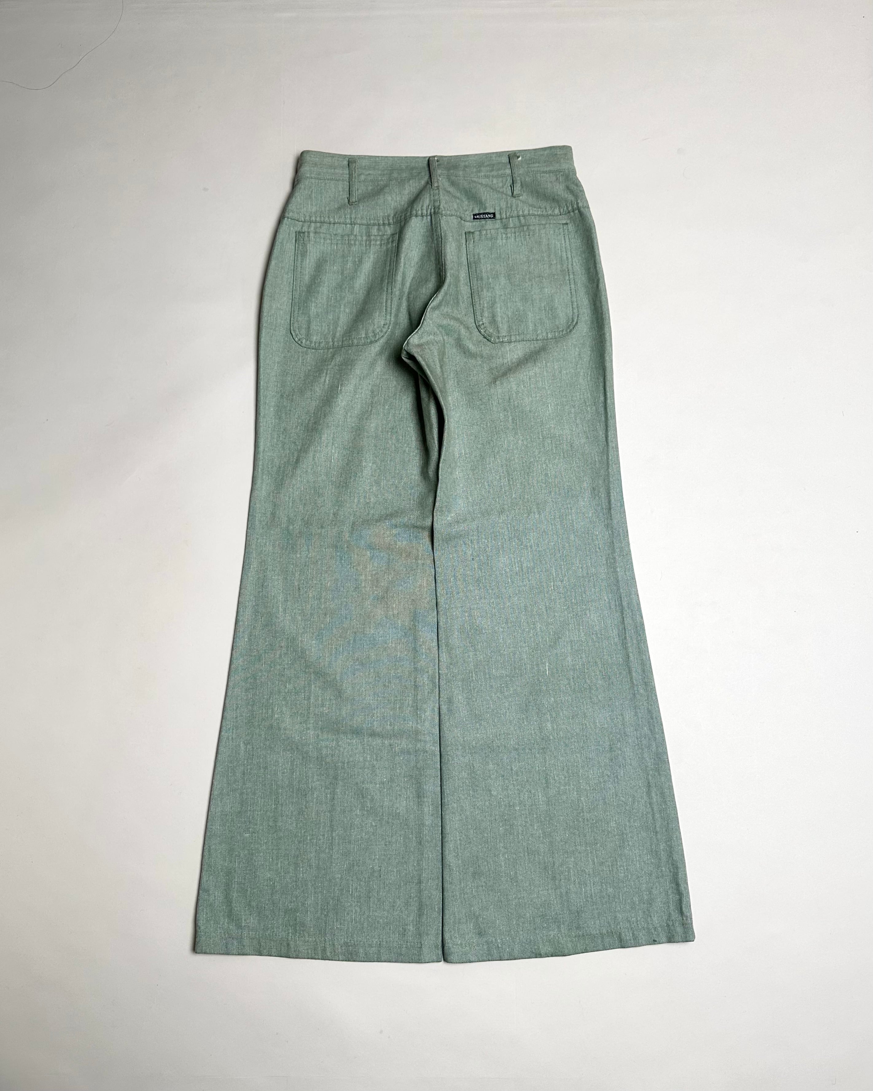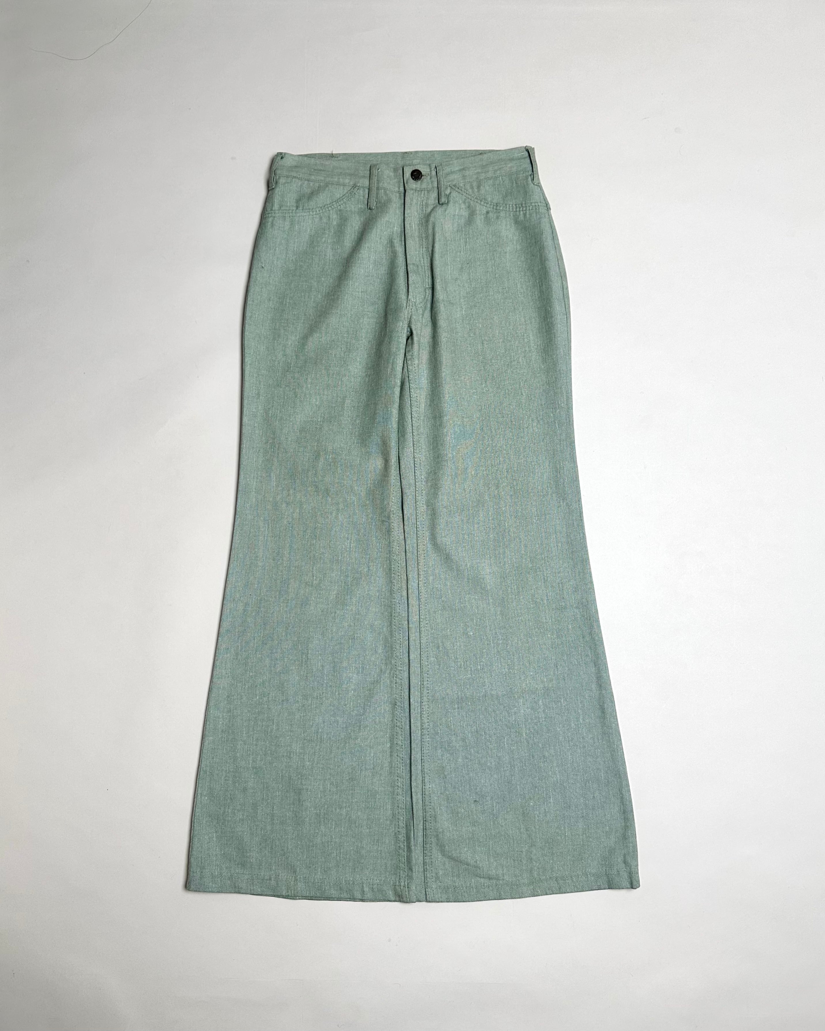 裾幅31.5cmの圧巻のワイドシルエットに、奥行きのある美しい縦落ち。ラグジュアリーブランドを思わせるライトグリーンのトーンも非常に印象的です。