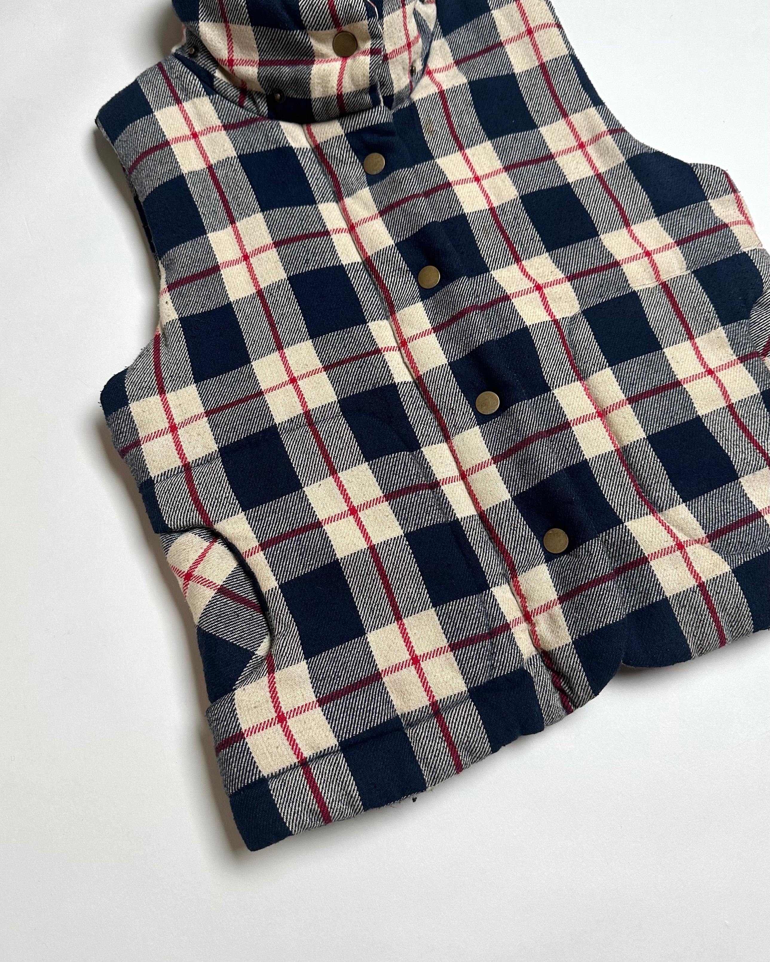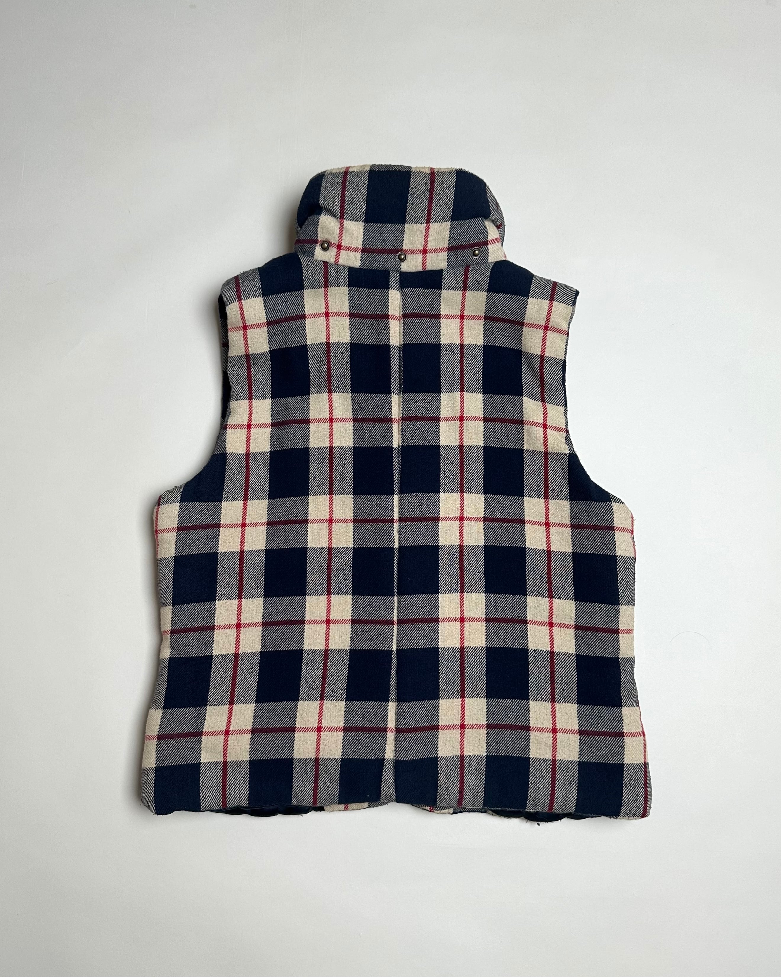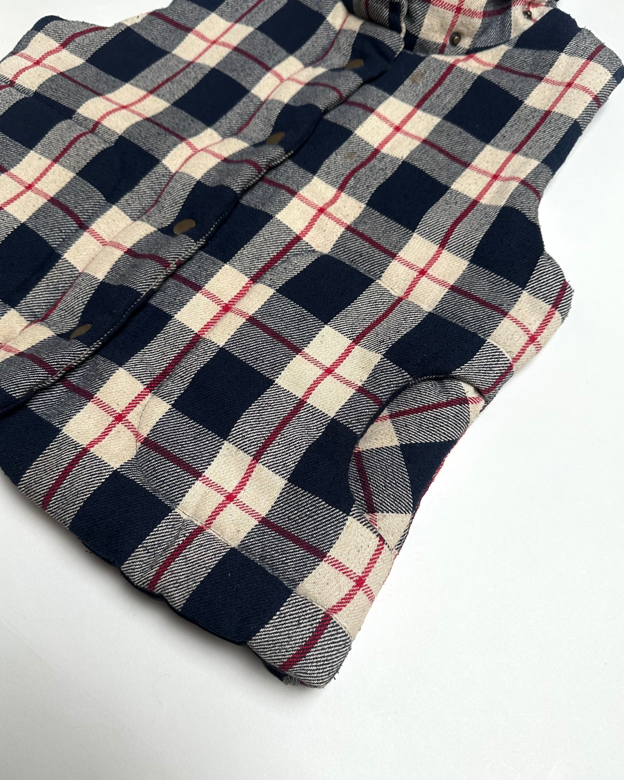 柔らかな織りのフランネルシェルに、ポップで目を惹く高配色チェックが映えるダウンベスト。