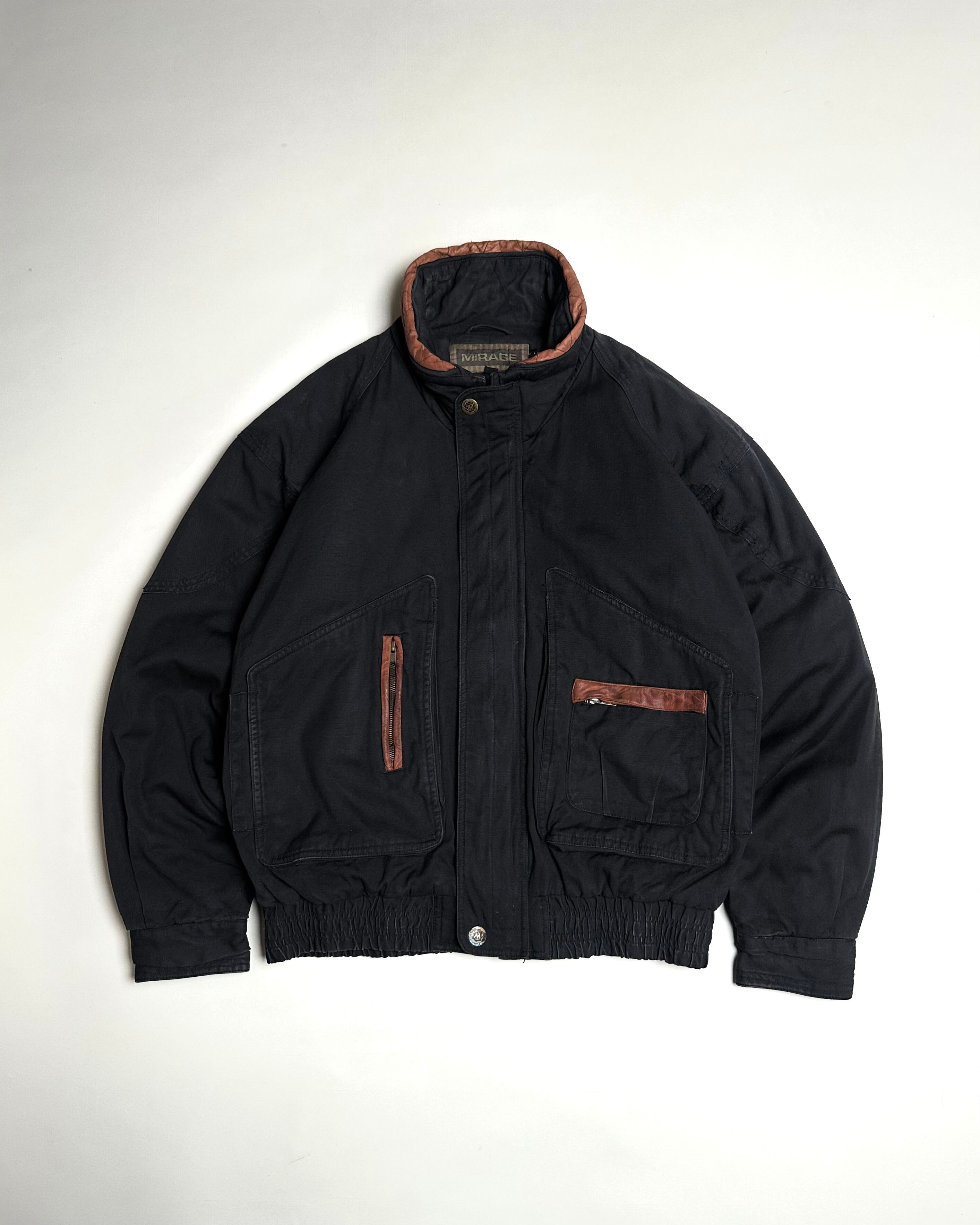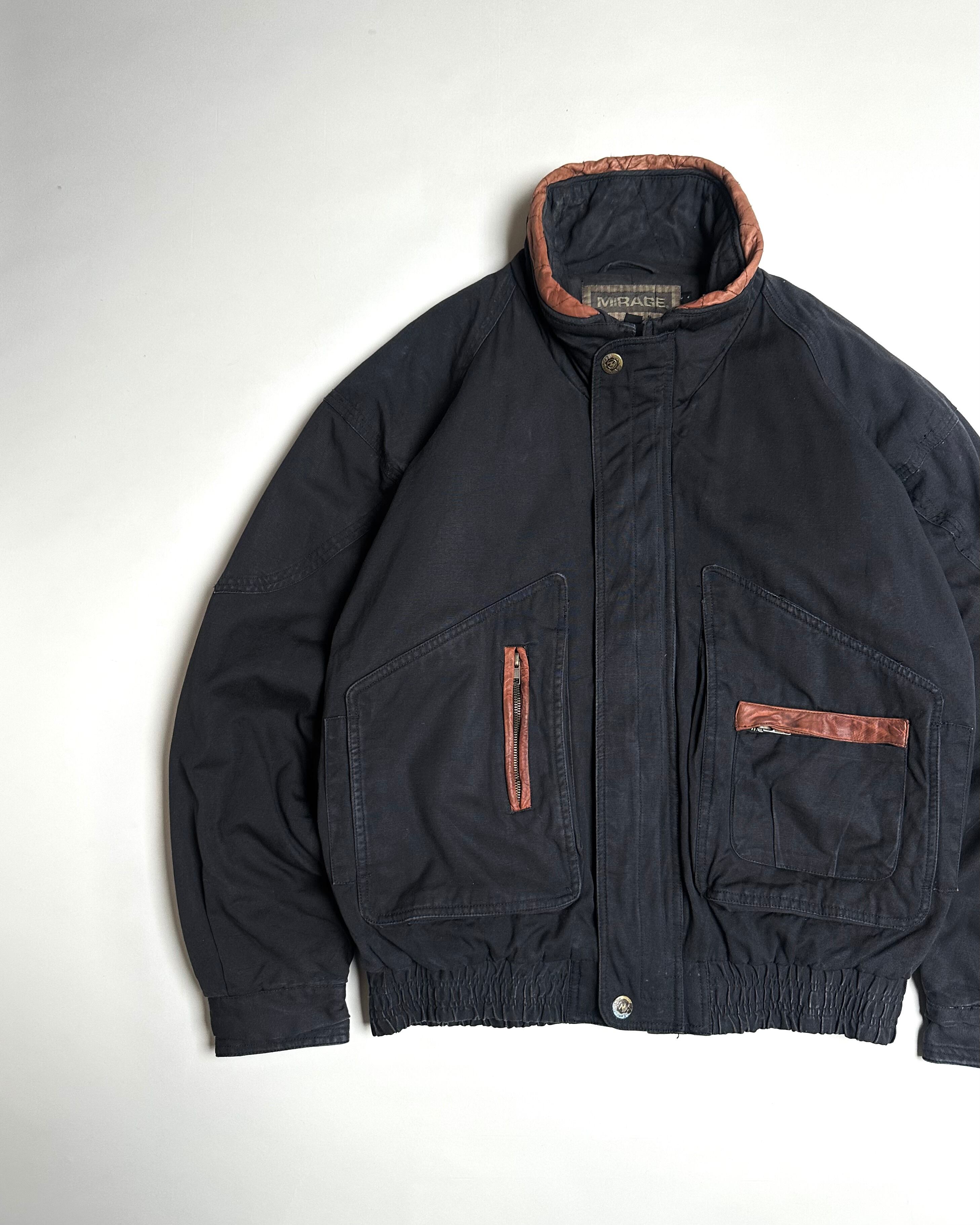 非常に柔らかなブラックのダック地にブラウンのレザーパイピングデザインが目を惹くジップアップパファージャケット。