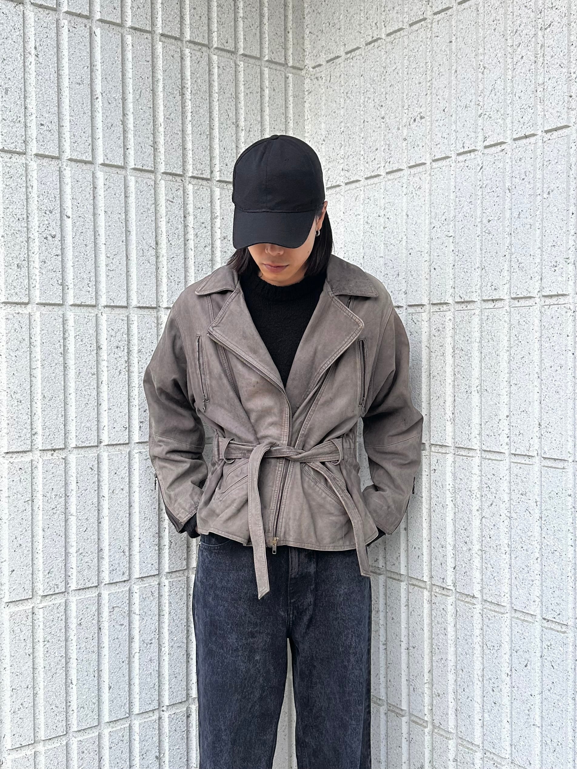 ショート丈にしたベルスタッフの様な見た目にリアルなエイジングのレザーの雰囲気と無骨なダブルライダースデザイン。そしてフェミニンなウエストベルトのデザインも魅力的◎