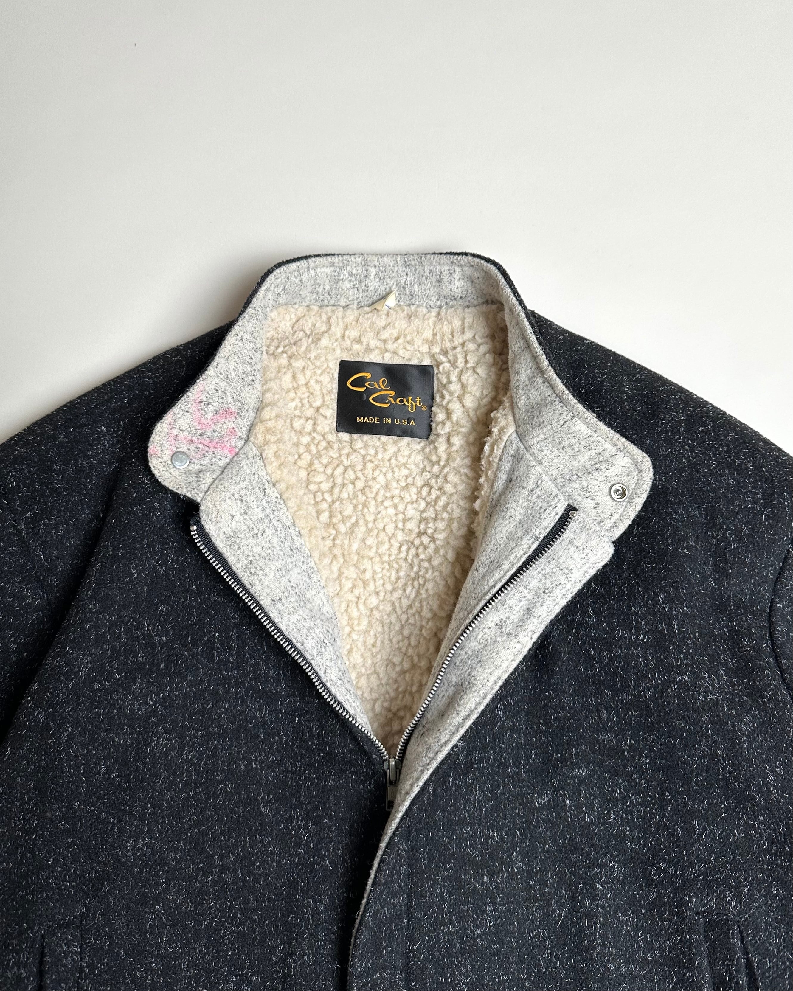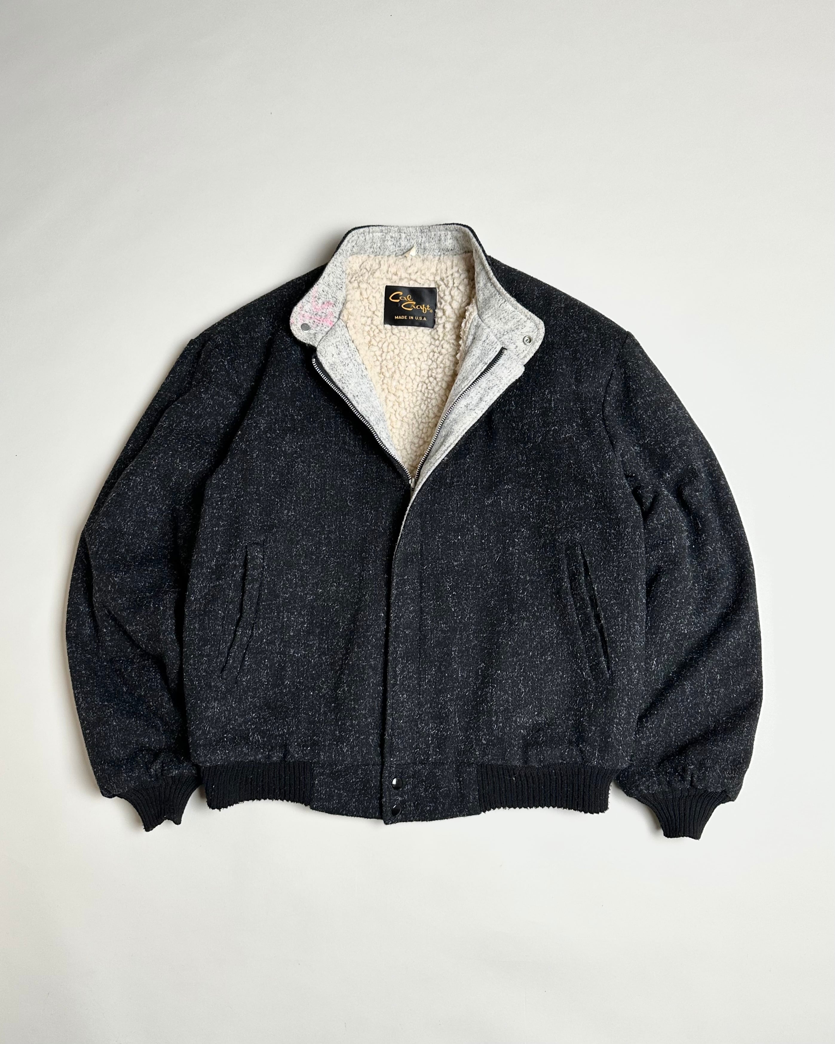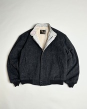チャコールグレーベースに白の糸でのネップデザインによる奥行きのある表情が魅力的なウールボンバージャケット。