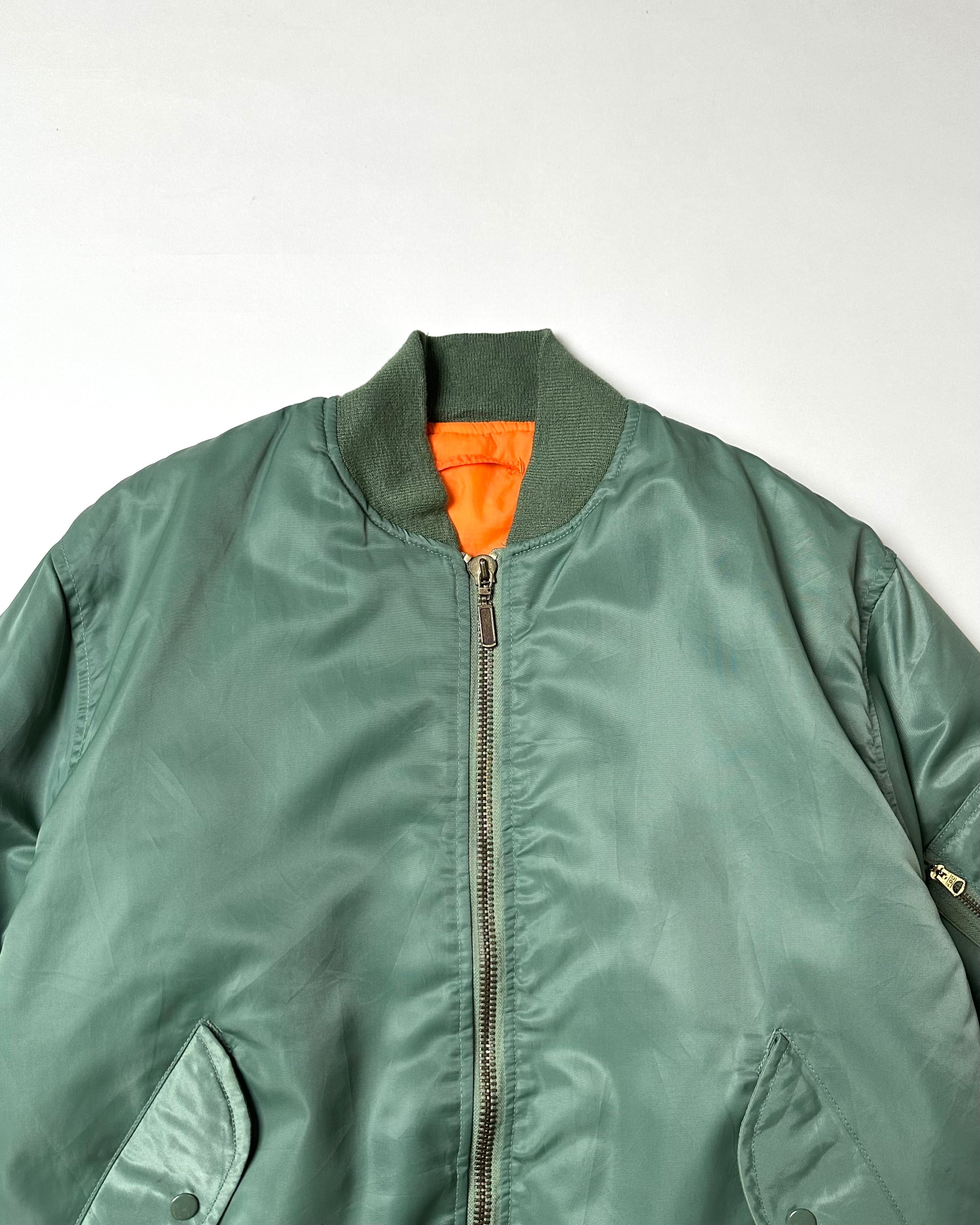 ハリのある高密度ナイロンシェルに光沢の載ったミリタリーオリーブカラーが印象的なMA-1タイプフライトジャケット。