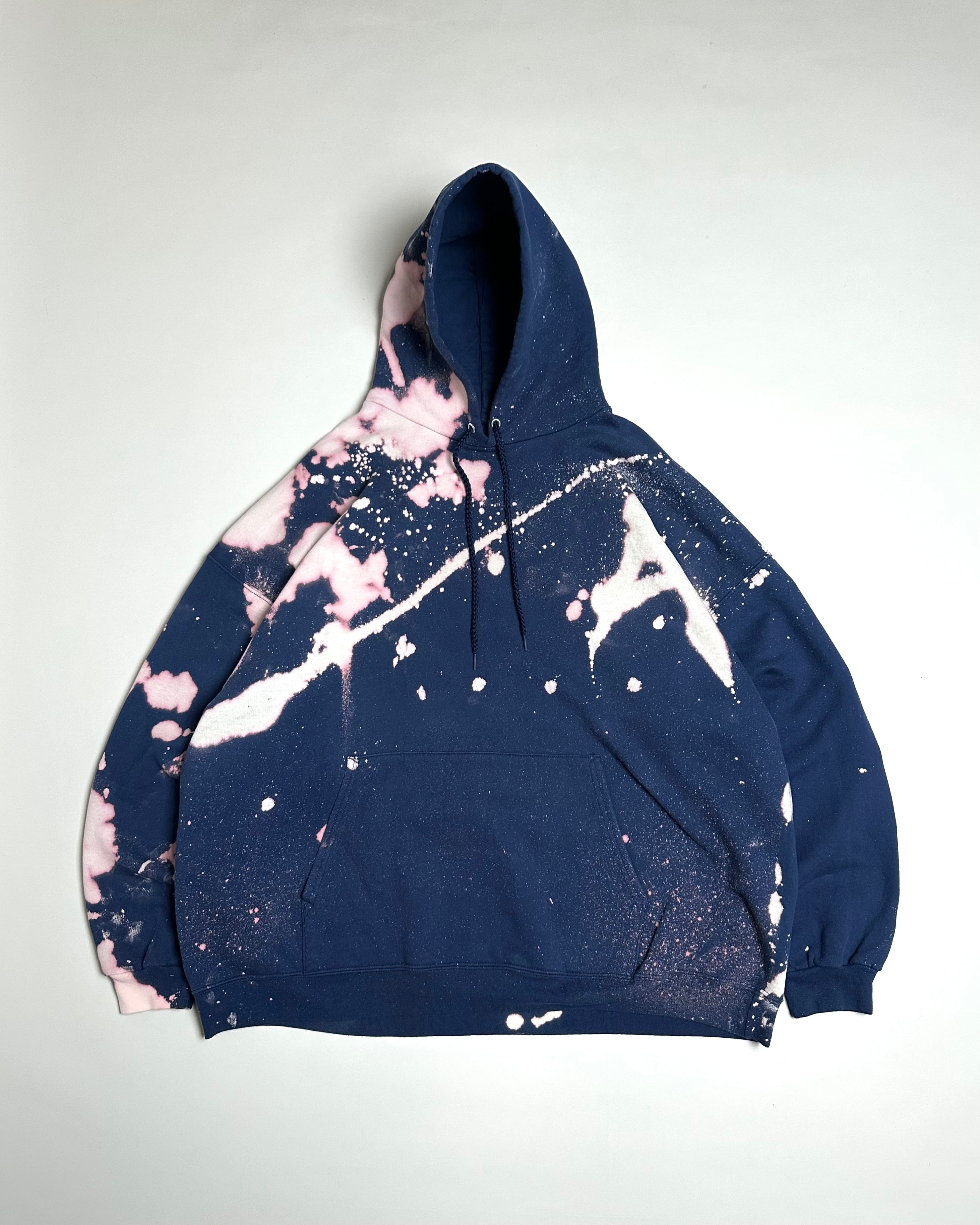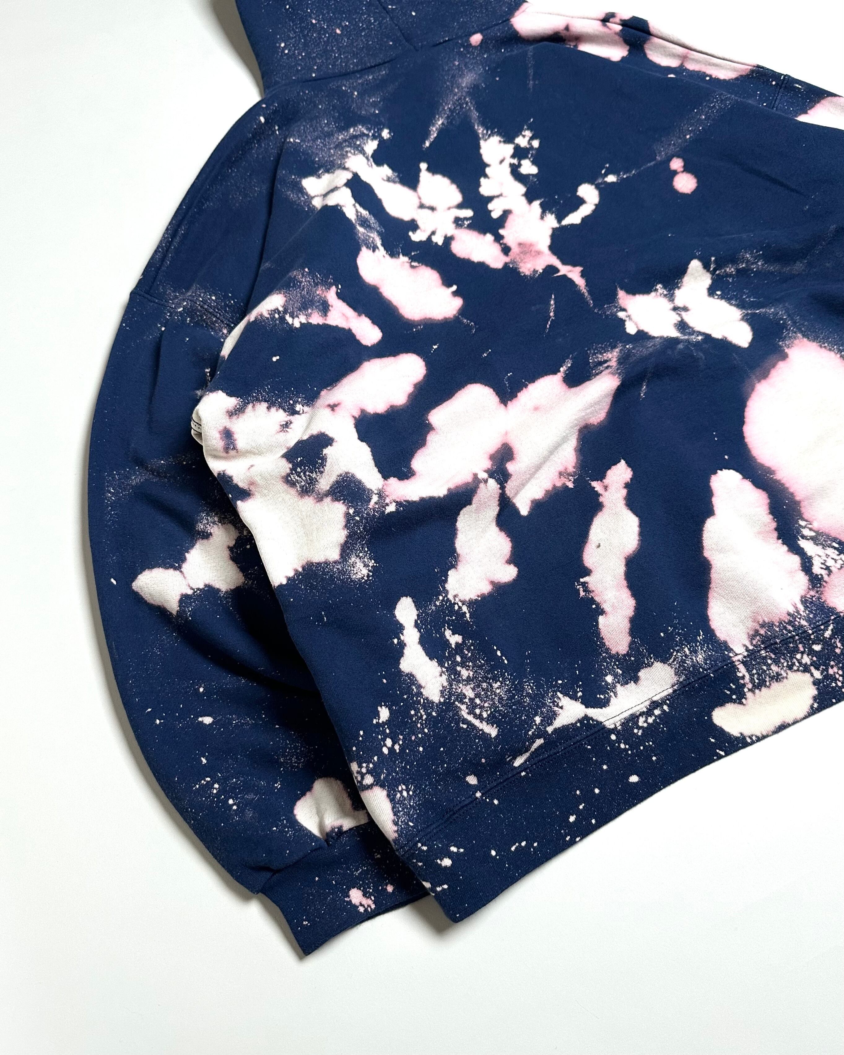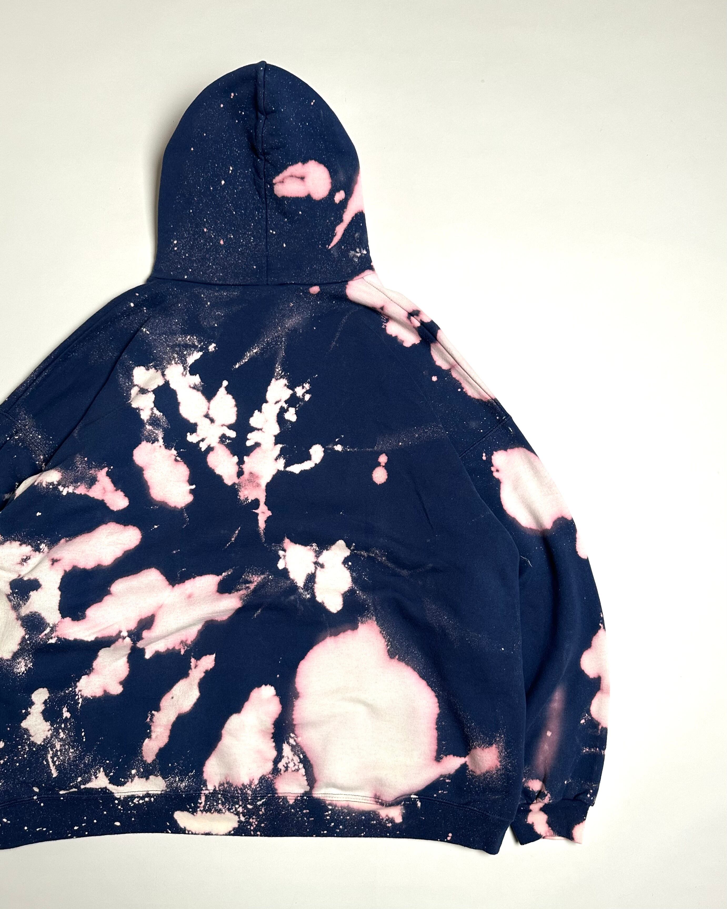 深いネイビーボディに大胆なブリーチ加工がされた存在感抜群のスウェットフーディ。