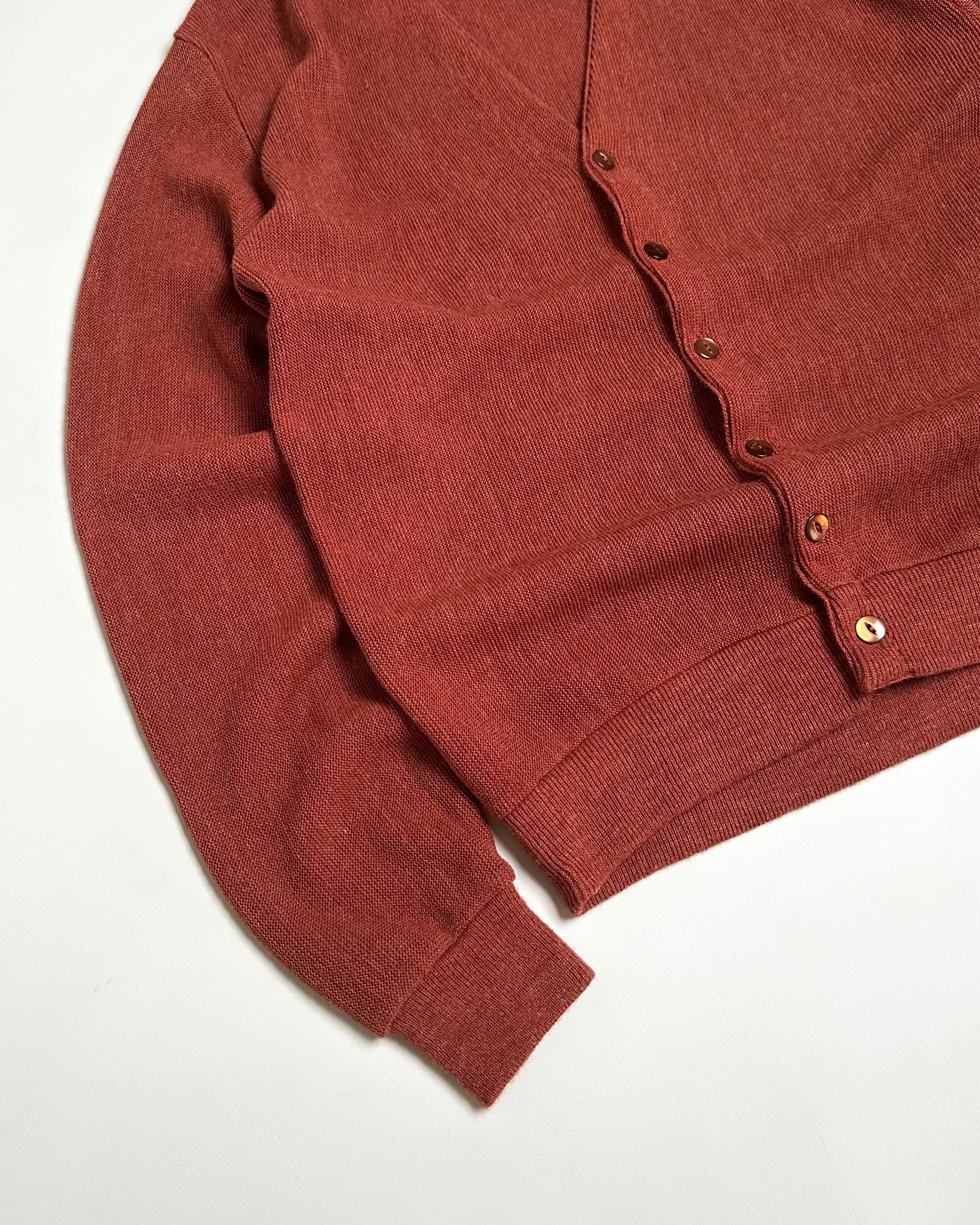 燻んだブラウンがかった大人びたオレンジカラーが目を惹く70'sアクリルカーディガン。