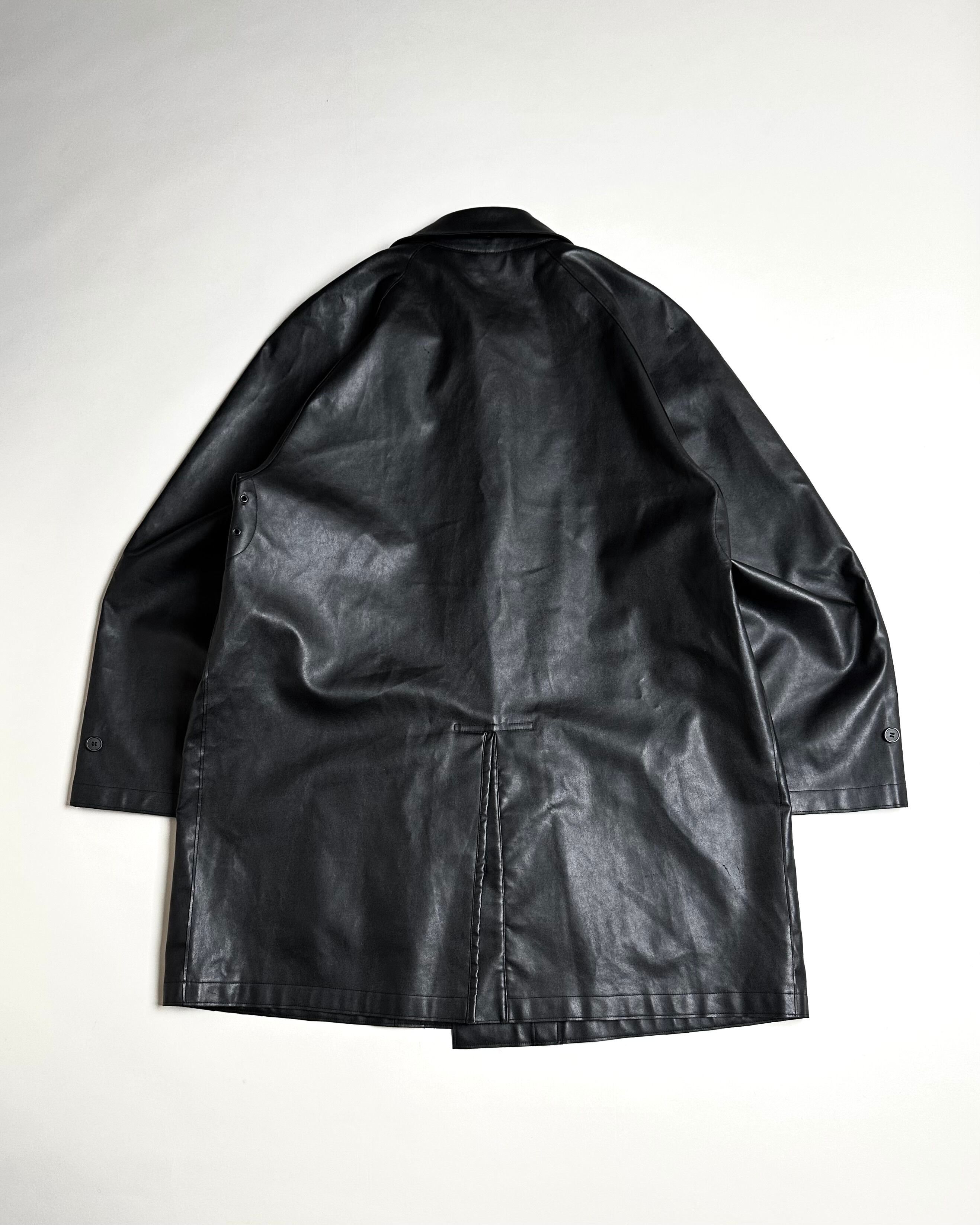 PVCコーティング加工によるリアルレザーの様な鋭い光沢の載った非常にモードな雰囲気漂うハーフコート。