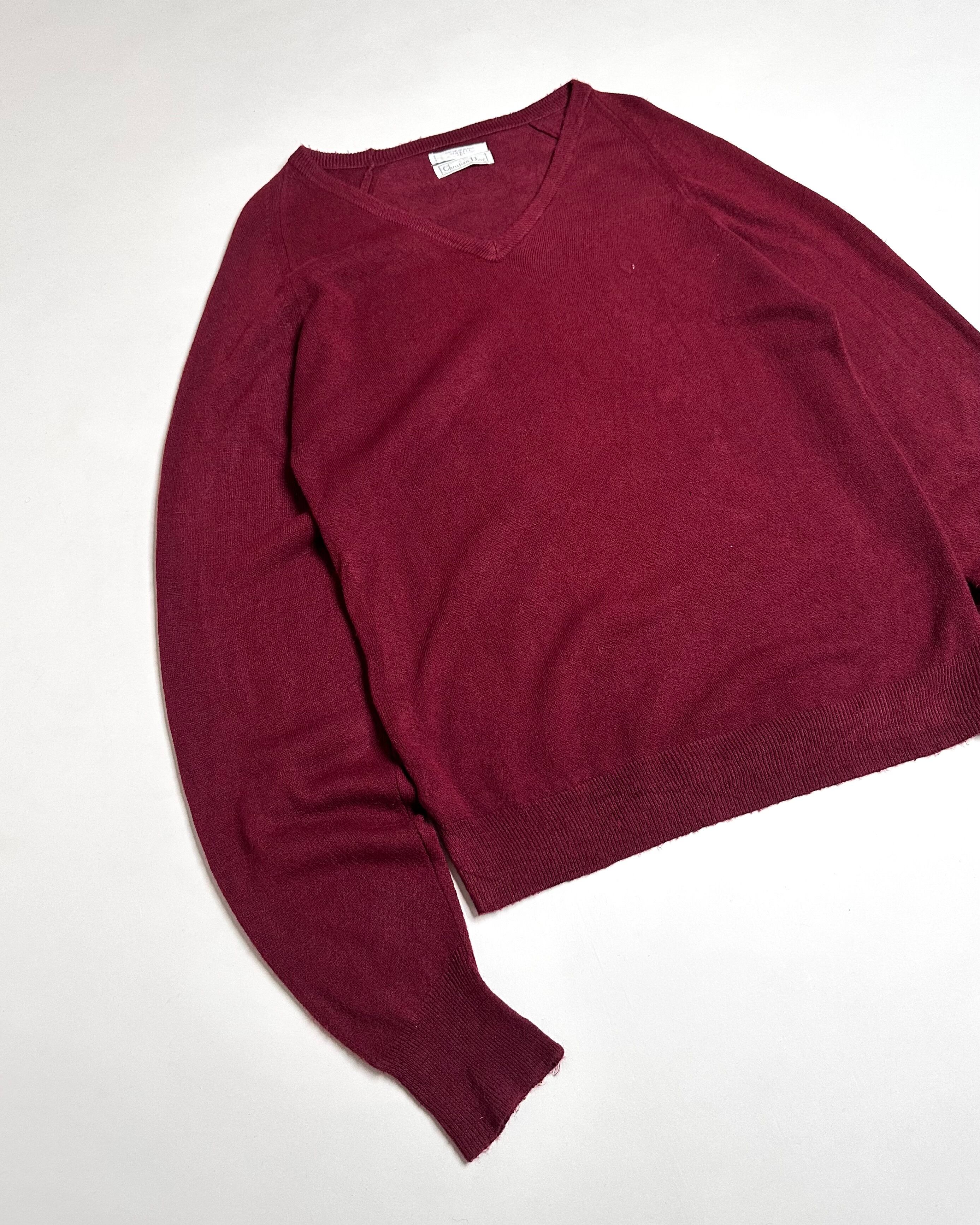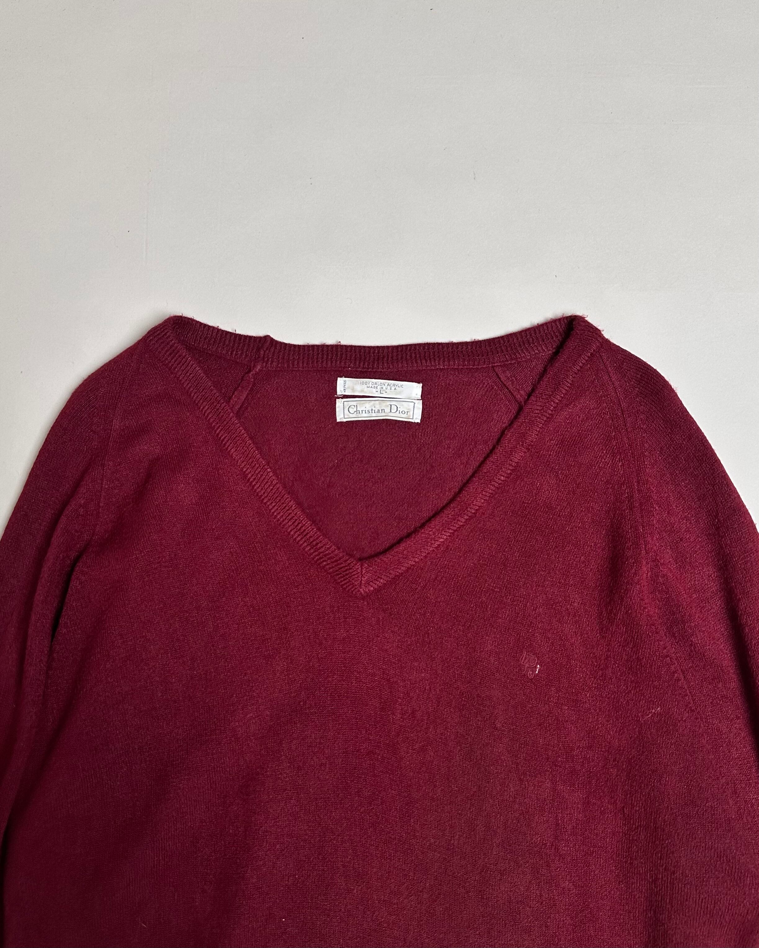 古いタグの付いた"Christian Dior"の深いワインレッドカラーが目を惹くVネックニット。