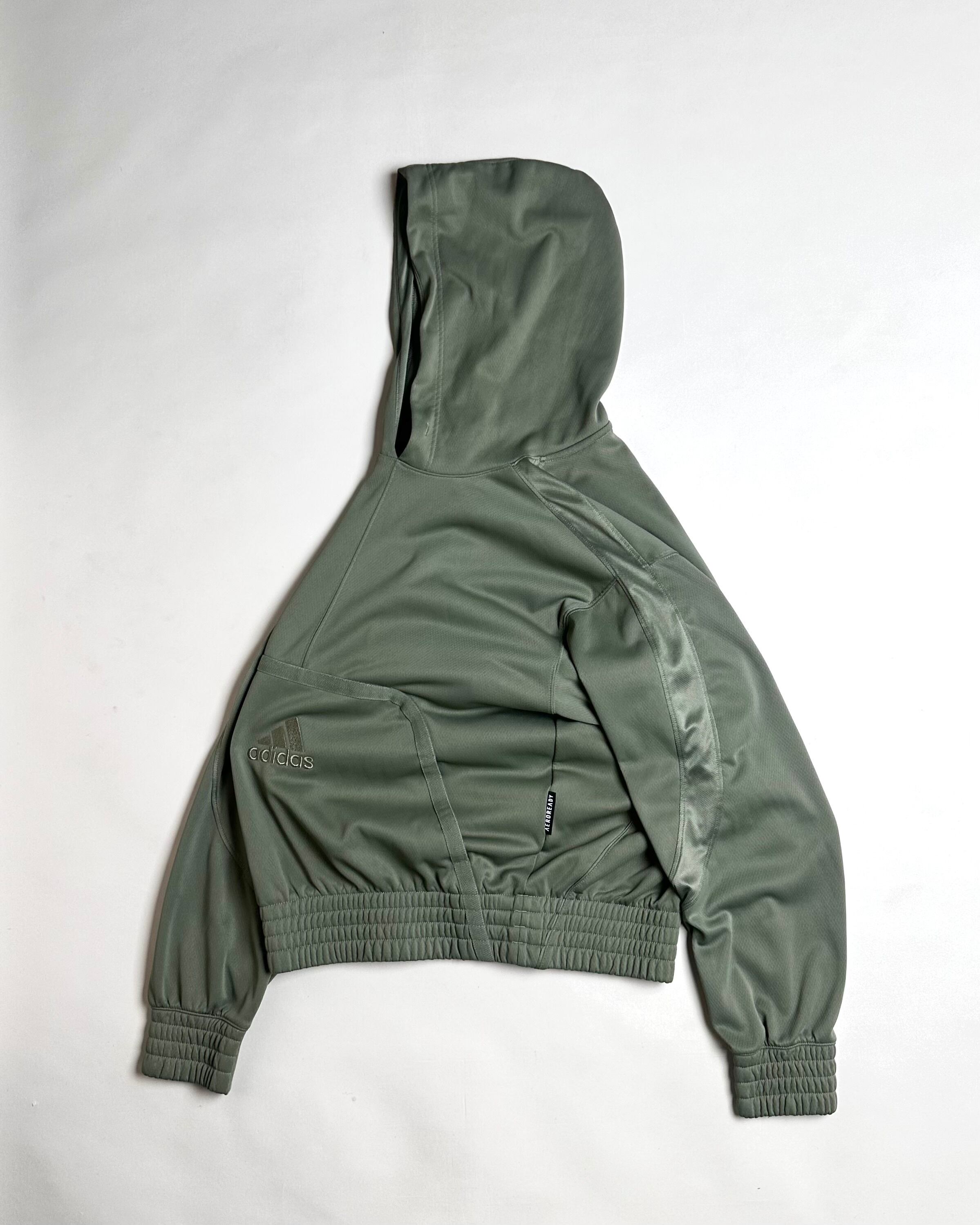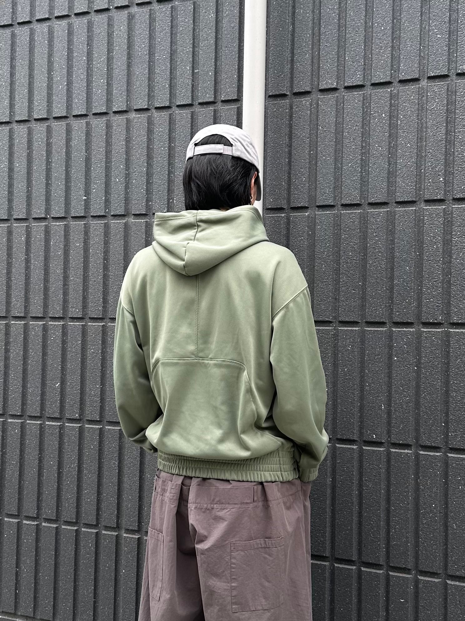 ペールトーンのグリーンカラーが印象的なジャージ素材のプルオーバーフーディ。