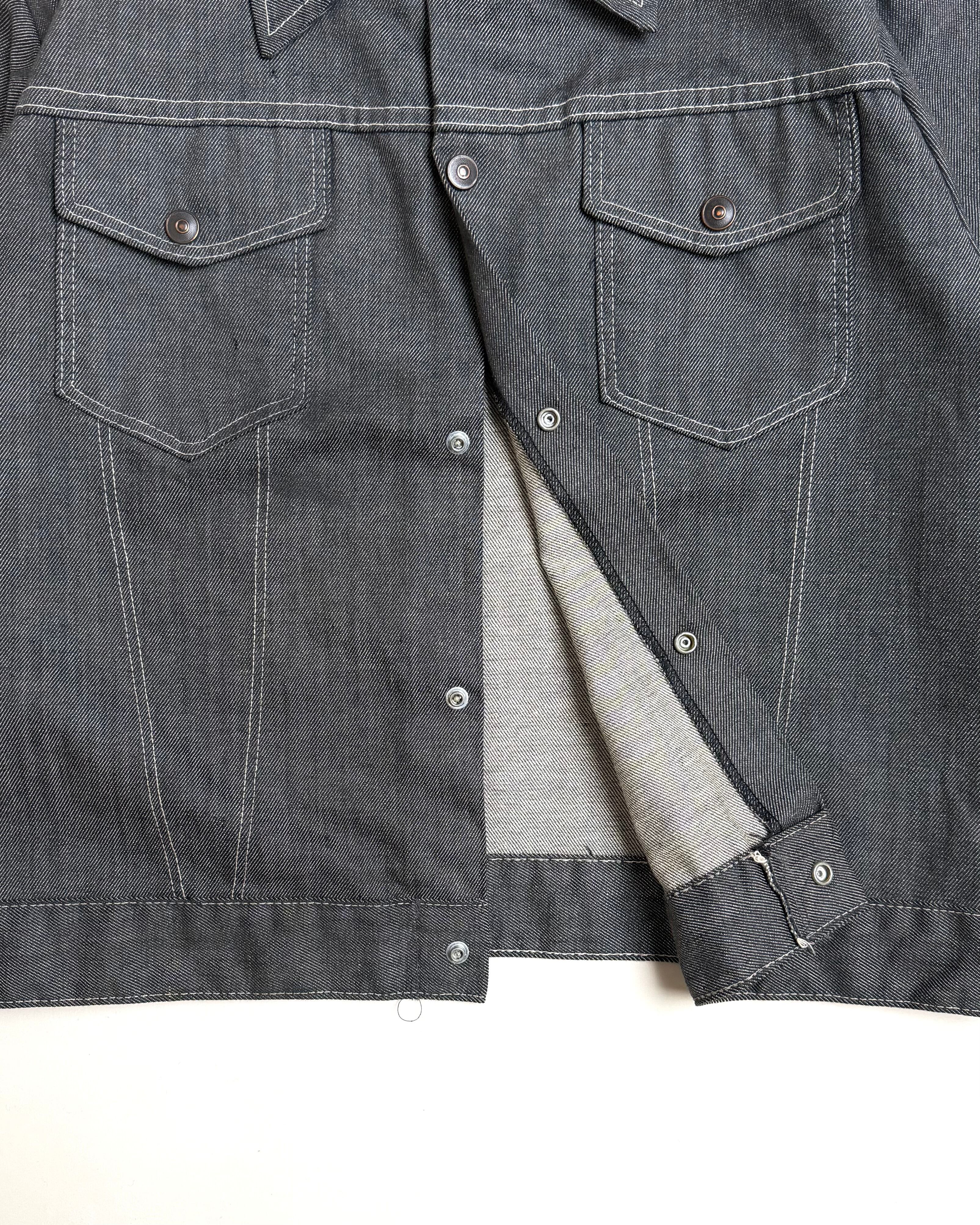 鈍いマットな光沢を帯びた、マットグレーのシャンブレー生地によるトラッカージャケット。