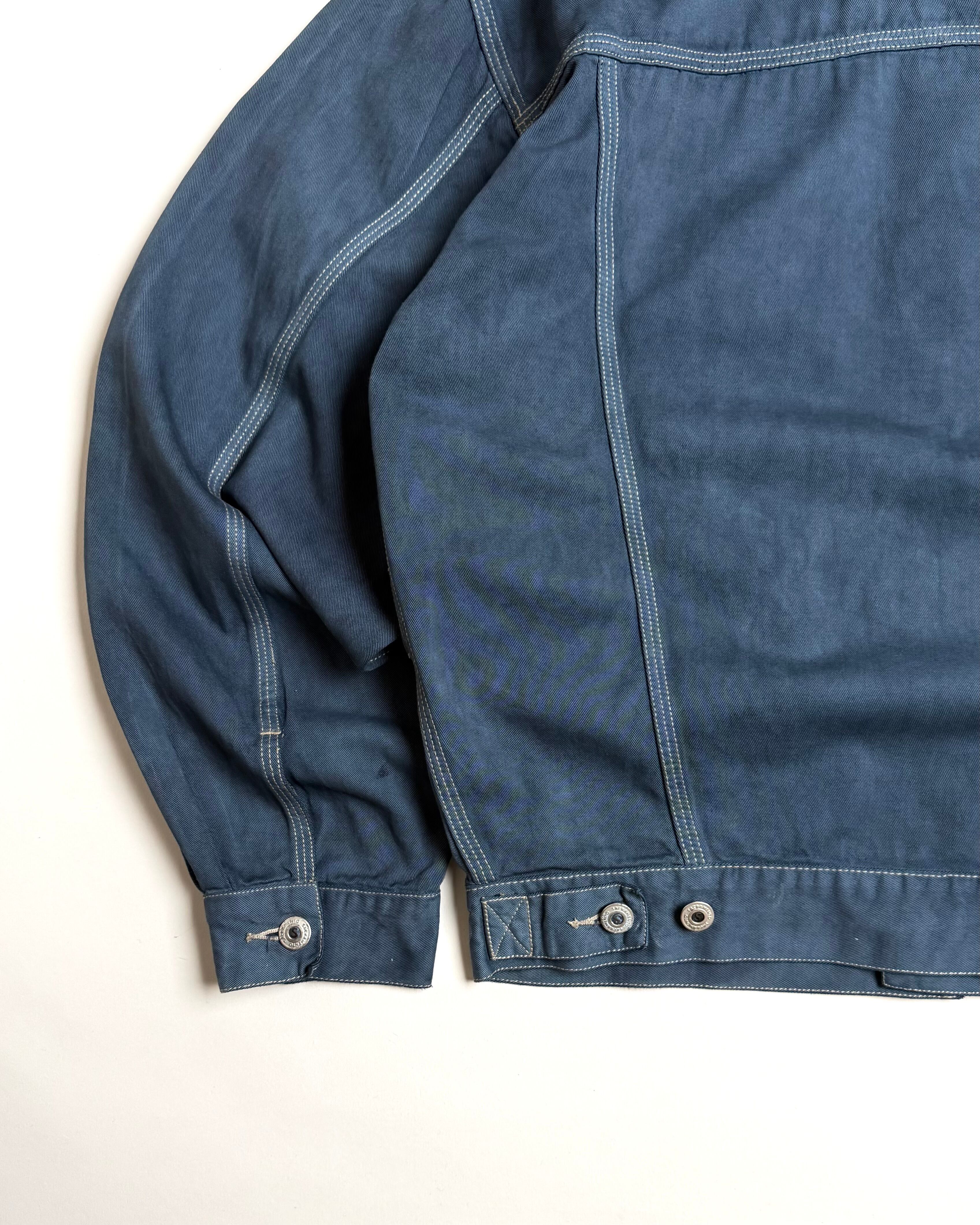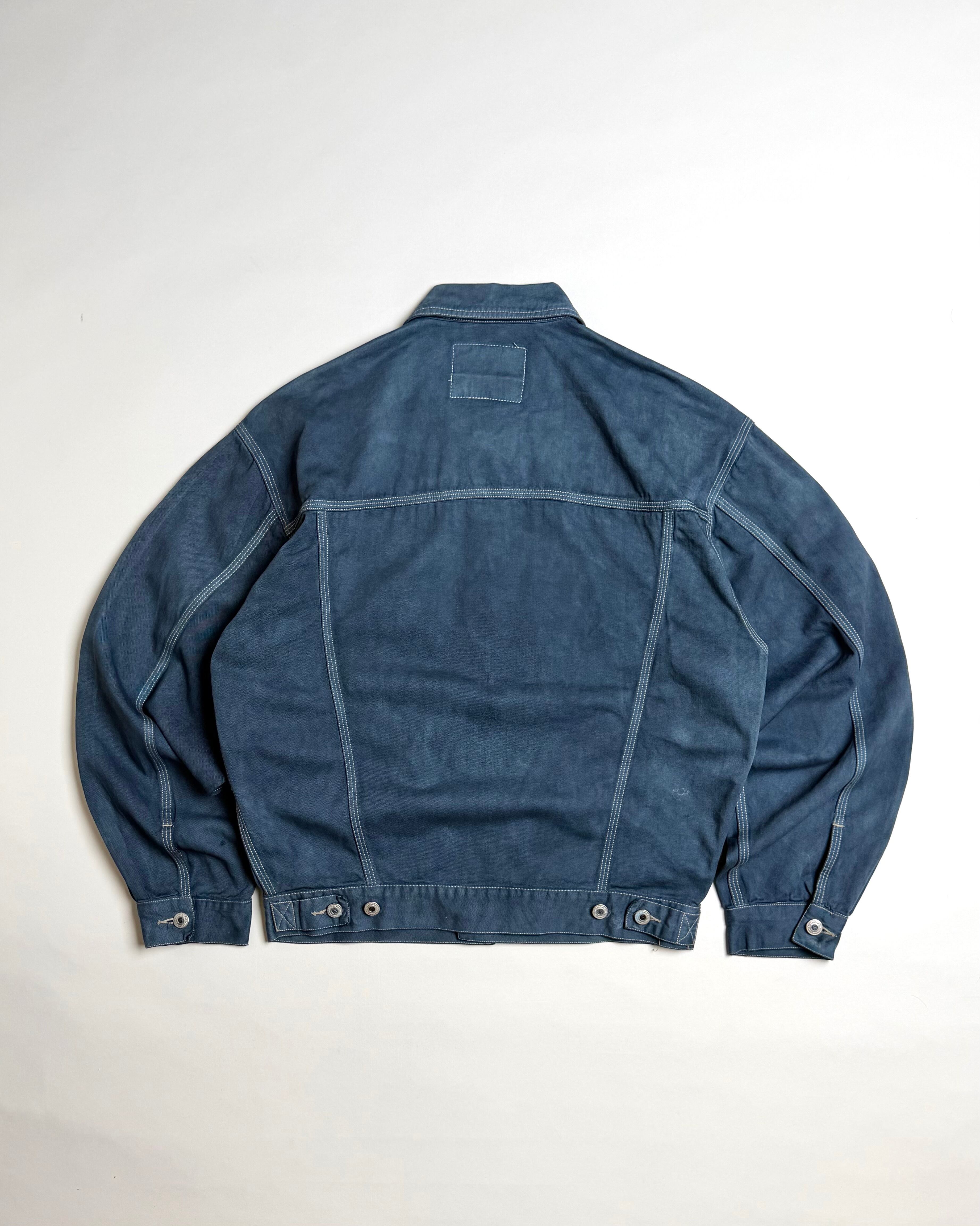 デニムを染色するオーバーダイ加工によるスモーキーなブルーカラーが魅力的なトラッカージャケット。